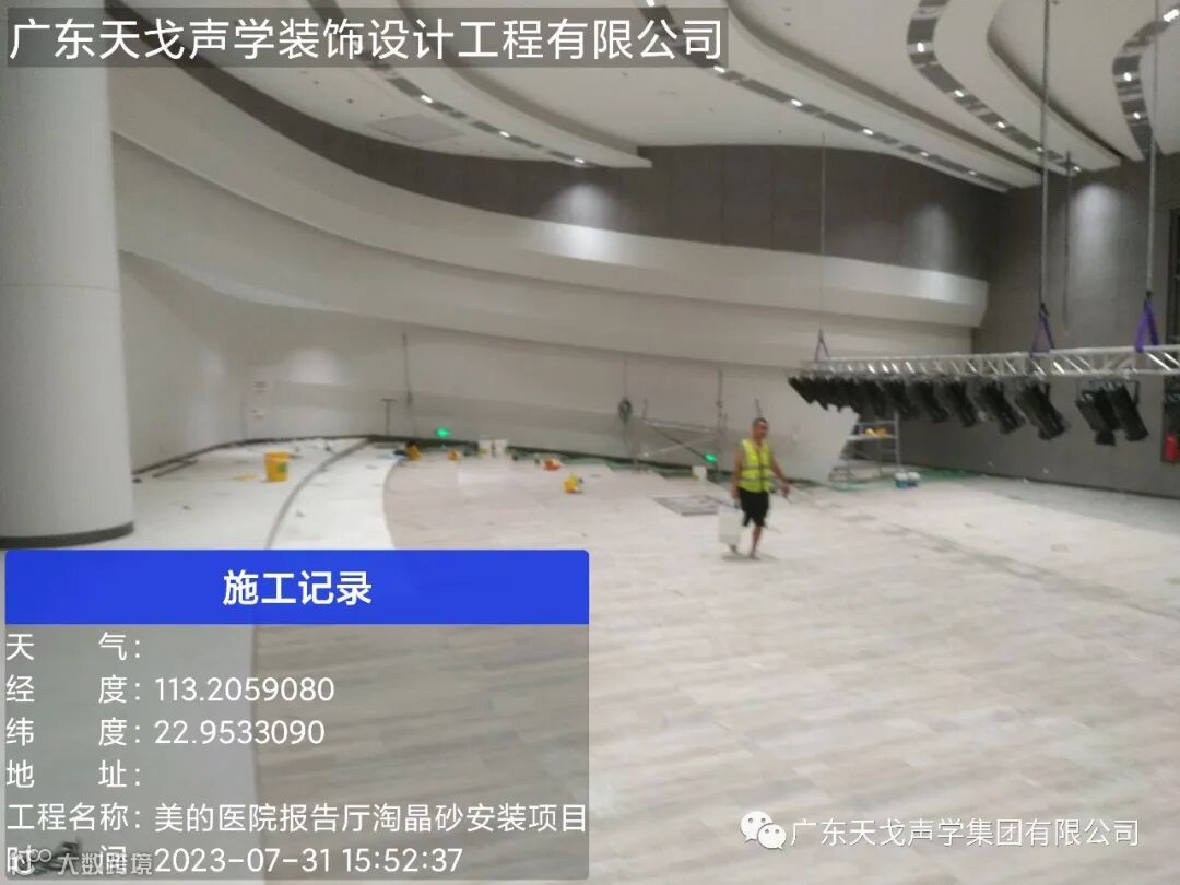 美的·和祐国际医院颠覆了传统医院建筑风格,该项目行政医院报告厅是由天戈声学集团提供声学装饰设计与施工,包工包料完大楼的声学处理,墙面采用自主研发穿孔吸音板以及陶晶砂吸声板。穿孔吸音板使用面积430平方米,陶晶砂吸声板达到650平方米,工期仅为一个月。