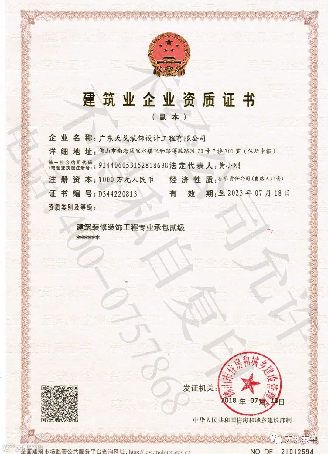 天戈装饰资质证书