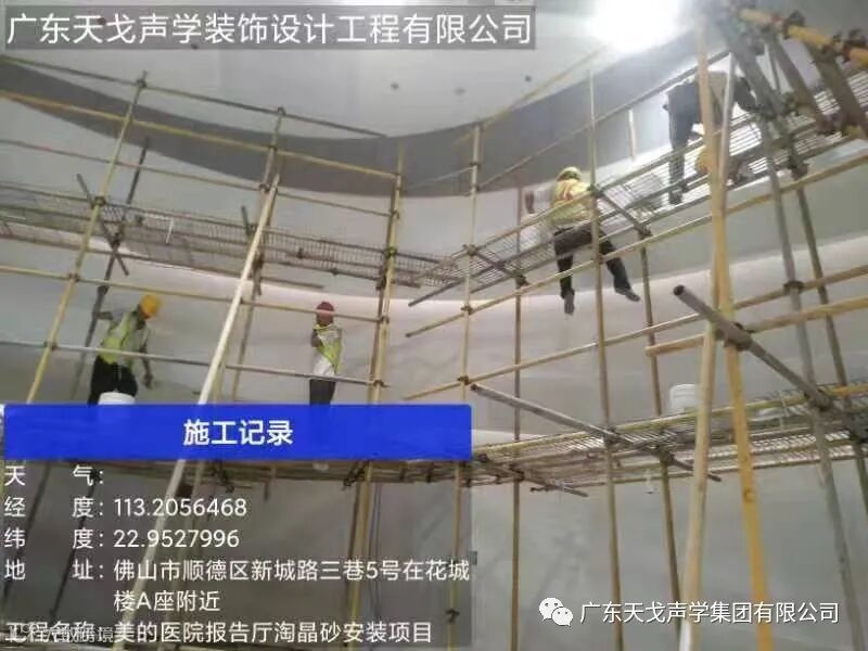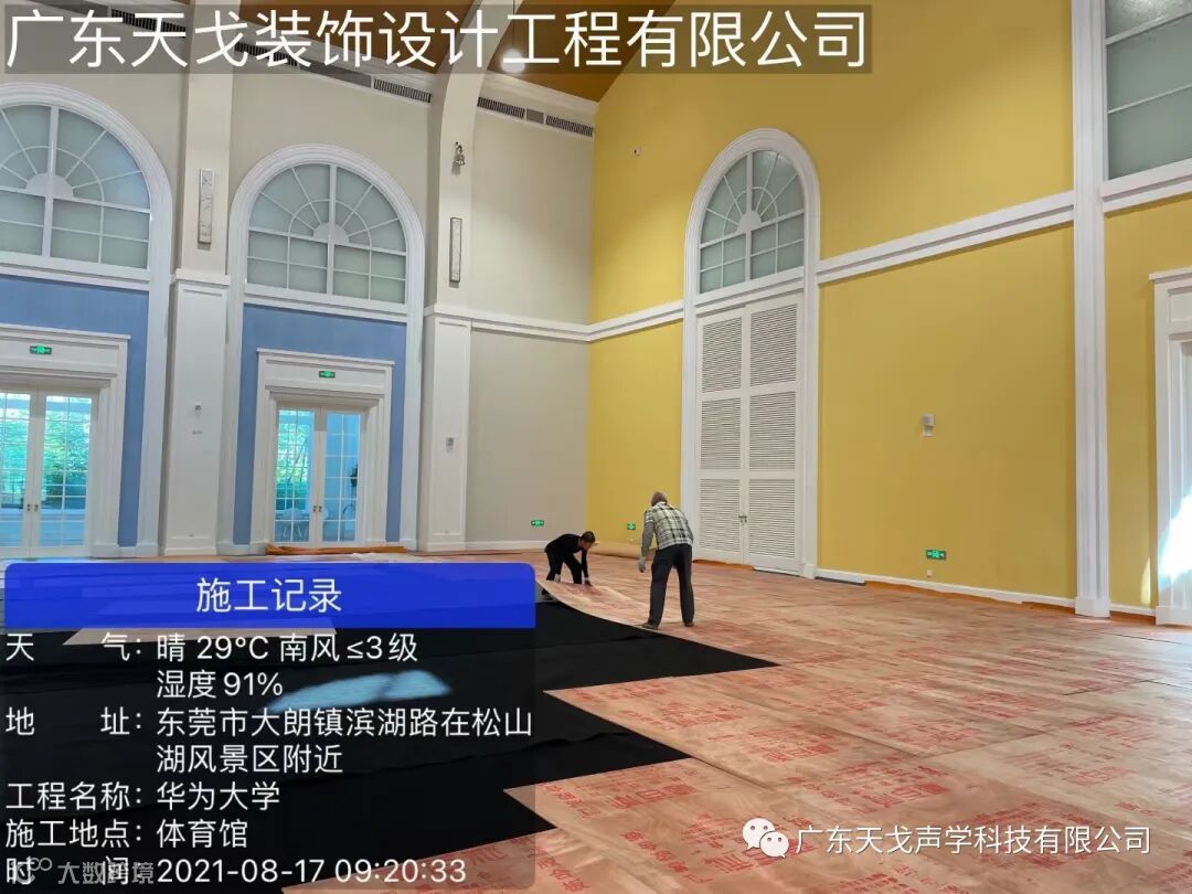 此项目为华为总部大学室内的篮球体育馆降噪改造工程,占地面积2252平方米,场馆容纳600座,天花部分改造施工的材料使用的是天戈声学自主研发生产A级防火铝穿孔吸音板。工程难点因整体的高度达到17.9米,地面木地板已经安装完成,无法使用登高车等高空设施,针对此问题我们改造使用为活动脚手架高空作业施工,铺设地面的保护,使用保护膜、9厘厚的阻燃夹板以及防潮地毯 三层的地面保护,改造完工后混响时间由原先的1.9秒降低到1.3秒,而且根据华为的环保高要求,施工现场场馆四周都做了现场围蔽的环境保护。整个F2EPC项目工期时间紧,仅用23天完工。