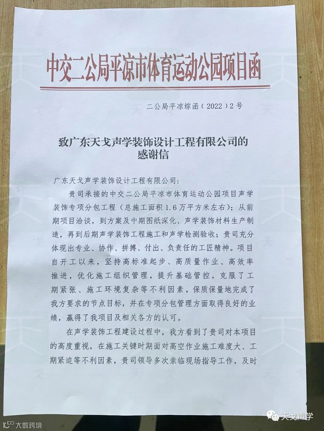 完工后经过专业的声学检测,各项指标均符合原设计标准,场馆音质丰满,清晰、声场分布均匀,平均混响时间达到预计要求,满足该体育场馆的的多功能用途。对此,中交二公局平凉市体育运动公园项目部给天戈声学写了感谢信,对天戈声学在该项目的付出和专业表示认可!