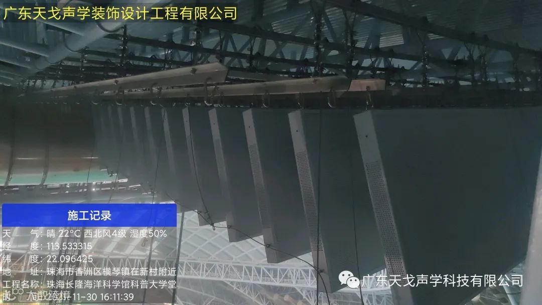 该项目做了三个场馆:体育馆、多功能报告厅、食堂;由于食堂人员比较多,吃饭时间噪音比较大,食堂的天花做了吸音改造,增加玻纤天花降低混响时间,总声学处理面积3086平方米。体育馆的声学装饰方面,天花面积362平方采用天戈声学自主生产的空间吸声体、墙面采用阻燃槽木吸音板。报告厅声学处理面积615平方,场所可容纳350座,此项目难点:体育馆空间高,多功能报告厅空间低且因项消防及排水管不到位,天花造型复杂梯级多,需要装饰铝板与吸音板相结合,导致施工难度大,天戈声学专门成立专项小组攻克安装难题。而天花采用的是天戈声学自主研发的铝穿孔吸音板。三个场所,均由天戈声学整体 设计、材料生产、施工,工期仅用2个月顺利完成,并且经过现场声学测试,达到了预期的要求。