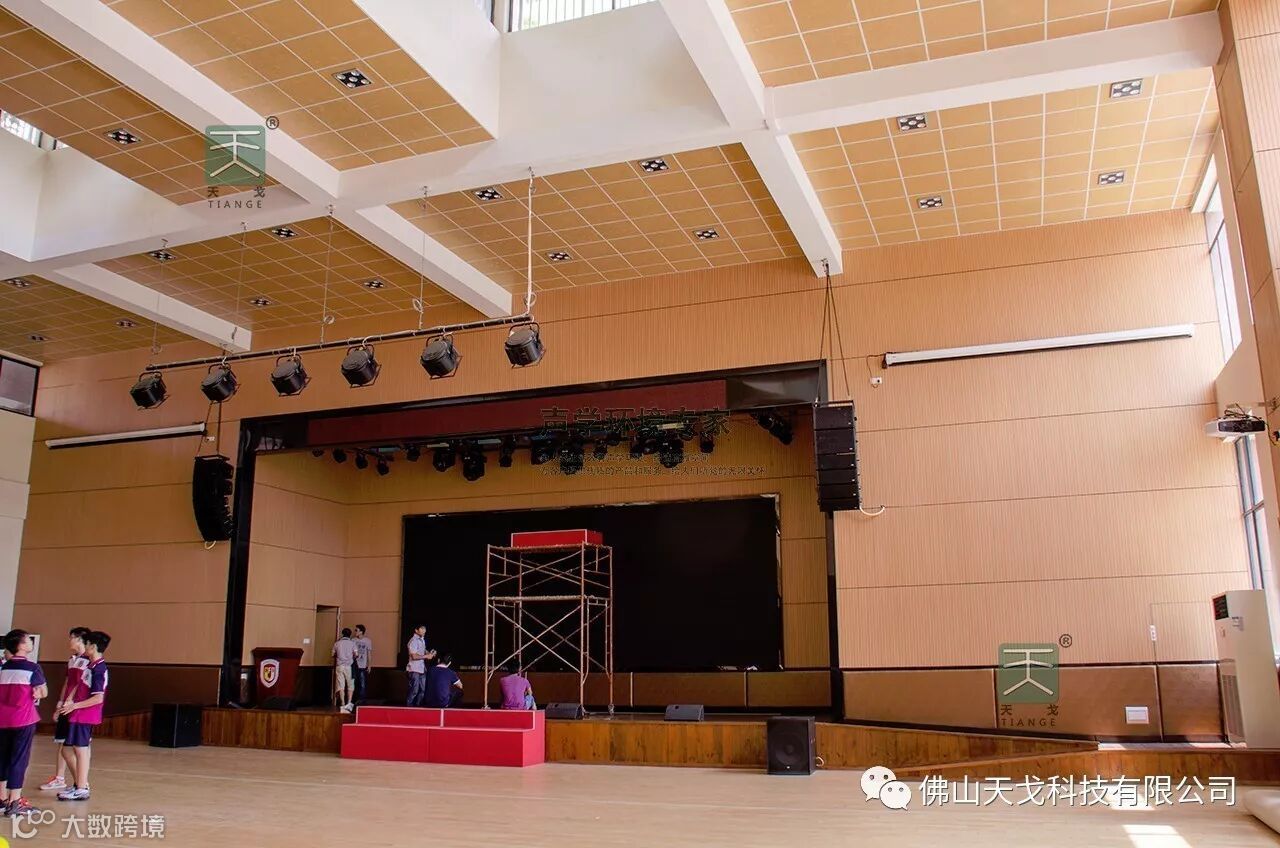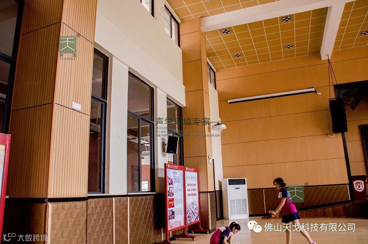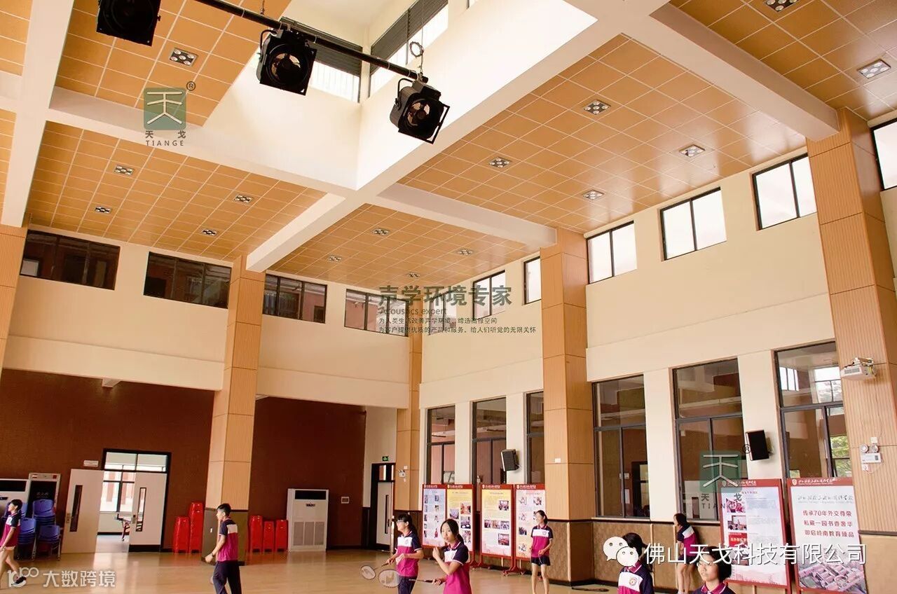 以上是风雨球场的完工照片:风雨球场的天花用的是穿孔吸音板,墙面用的是条形槽孔吸音板,同样美观、大气。