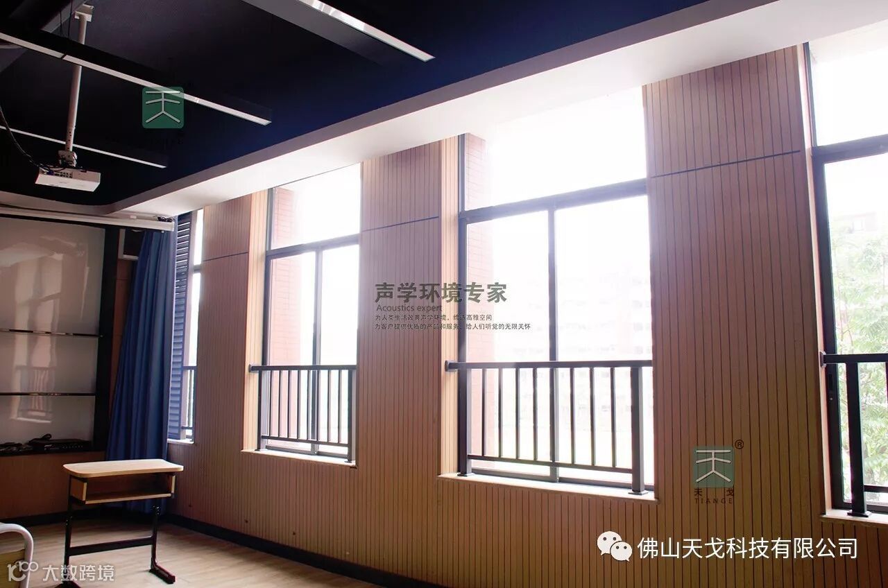 每个教室的墙面都安装了条形槽孔吸音板,颜色为暖色的黄橡颜色。