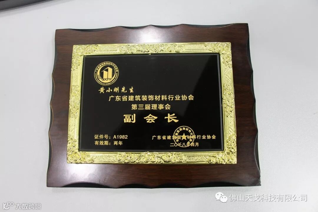 协会的宗旨是坚持为企业服务,为行业服务,为政府服务。黄董表示,此次当选广东省建筑装饰材料行业协会副会长对其个人、对佛山天戈科技有限公司来说都不仅仅是只一份荣誉,更是一份责任、一份担当。要坚持品牌创新推动企业可持续发展,更要肩负起持续提高行业技术、服务水平的责任,携手协会其他成员单位共同构建建筑装饰行业的美好未来,助推广东、乃至中国建筑装饰产业的蓬勃发展!
