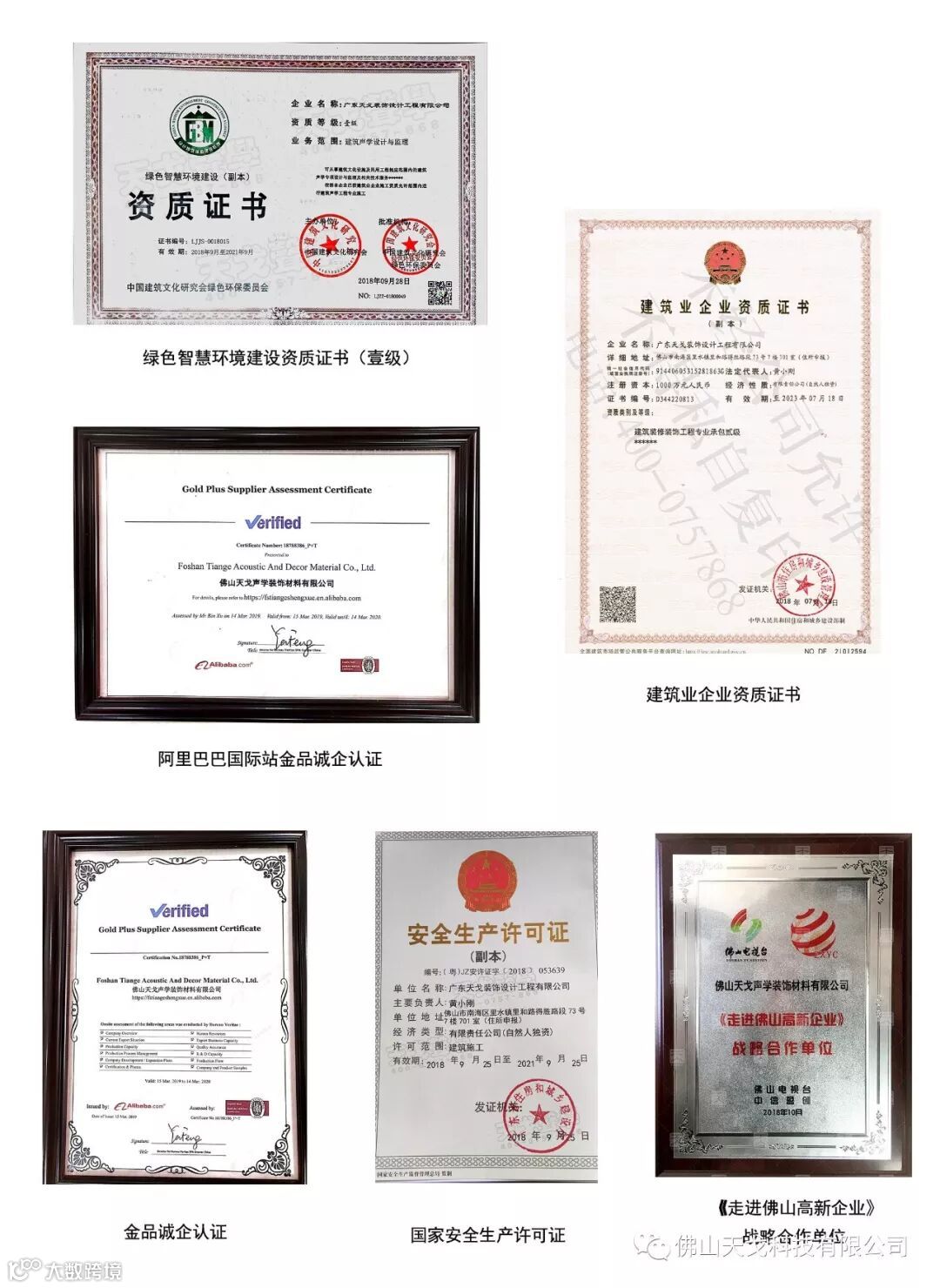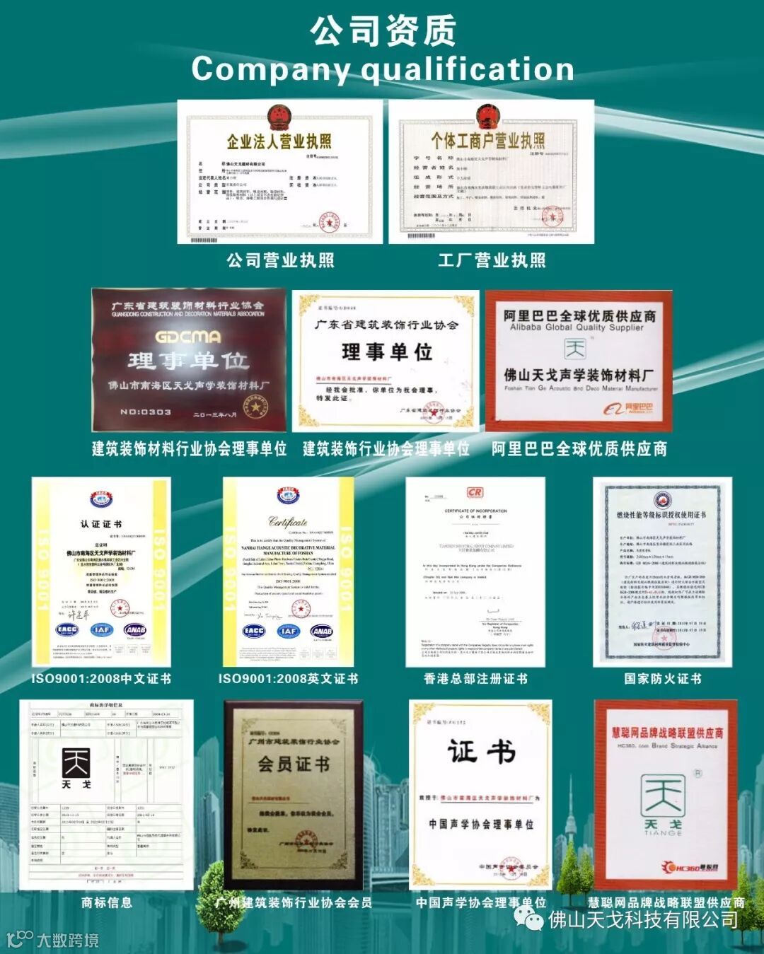 天戈集团成立于2008年,是中国一流的声学装饰整体解决方案服务商,旗下拥有自己的声学装饰设计公司、营销公司以及自主1万平方米的生产工厂。我司被评为广东省高新技术企业,是国家《民用建筑隔声设计规范》和《超大公共空间建筑声学设计规范》参编单位,中国舞台美术学会剧院建筑与舞台技术专业委员会专家委员单位,拥有自主知识产权的专利产品30多种。天戈工厂获得ISO9001:2015认证,天戈产品获得欧盟CE认证、法国必维认证和国内外各种权威检测报告近100项,同时我司还具有建筑声学设计一级以及建筑施工二级资质,天戈声学,让饰界拥有天籁之音!