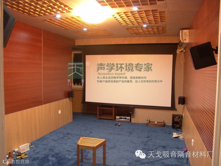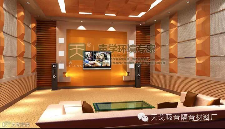 天戈建材建议看若听音室面积仅10多平方米,不宜再将四周墙做护墙壁,那么可在墙壁表面(考虑美观仅在离地1.2M高度)做80×80MM左右的四梭体木板造型均匀分布,其突起高度在20mm左右,形成均匀的扩散体,可将驻波打散,当然1.2M高度以上用软织物包上则更佳,整体装潢美观,建声效果又兼顾。对于软垫沙发、地毯均是吸中频为多,面积宜合适为好,最后还要考虑到人的吸声系数,加上聆听者人体对全频均有较强的吸声。这符合小房间的理想听音特性。经过这样处理后房子声音往复反射较强引起的严重的谐波共振的弱点将得到改善,此时反射较小,共振减弱。另外音箱背靠墙体要够结实坚硬,才能将音频和动态迫向前方的聆听位,松软又单薄地墙体结构会形成消弱作用,把声音中的能量抵消大半,特别是中低频方面十分明显。房间四边的墙身要尽量做到扎实,如果谐振波过于强烈才将其吸收或打散,用打散的方法是使它变成泛音,而在打散之后,如果中低频仍然存在驻波影响的,这时必须用较高密度的吸音装置强吸硬管或者吸音柱将驻波吸去。大面积光滑平面的侧墙和两面窗户玻璃、家具表面也应用窗帘之类的软织物遮挡起来。扬声器两侧的墙壁十分坚硬也是产生驻波的原因,在这些地方吊上挂毯一类的东西防止反射的话,细致的信息听起来会更加明了清晰。不过地毯这类的织物对中高频吸声比较理想,而对中低频的吸声则较差。另外不有一种改善方法,采用凹凸海绵(约40-50MM厚)镶在后墙上,防止主音箱的反射声,四面墙体也可用此方法,市场上用于鸡蛋包装的防震垫,吸声效果也佳,但外观欠佳。这些建声处理前提是要牺牲些厅室内的实际面积,因此面积小于15平方米听音不能采用理想的建声处理方法,否则有效面积太小。