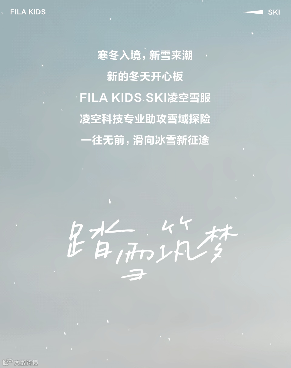 寒冬入境,新雪来潮 新的冬天开心板 FILA KIDS SKI凌空雪服 凌空科技专业助攻雪域探险 一往无前,滑向冰雪新征途 踏雪筑梦,勇闯无垠雪境 意大利四大品牌强势联名 致意FILA KIDS百年专业滑雪基因 FILA KIDS x 高端意大利滑雪品牌VIST X意大利滑雪圣地 KPONPLATZ x 世界第一造雪机TECHNOALPIN 即刻调动激情因子 实战雪场,率先开滑 单板开场,乘风破雪 滑跃无尽自由 10000/m²/24H以上,高性能透湿保持干爽 优越金标Primaloft,高效蓄热保暖 直面凛冬,只管尽情飞驰 荧光蓝滑雪服洋溢活力氛围 套头式款型配备酷炫侧开拉链 胸前高周波立体工艺凸显FILA高品质 荧光色彩,惊鸿上板 个性随心所驭 一抹吸睛荧光浪漫红 及滑雪裤3M反光印花 护航安全探索 肆意滑行,勾勒雪场英姿 双板齐驱,风雪无阻 炫技凌空跳跃 滑雪服 机械模块化拼接设计,凸显户外机能感 日本进口Dermizax专业防泼水面料 耐水压>20000mm/H2O 最佳性能时刻在线,全天候御防雨雪侵袭 搭配Y型提花背带式滑雪裤 腰部双侧配备收腰魔术贴 适配任何身型,激活疾速潜能 冲破桎梏,舒适自在掌控 凌空科技3D版型,合体剪裁 无束对峙复杂雪况, 高难度动作也能轻松秀出 让每一次回转,都自由自在 Y型提花背带式滑雪裤,弹力十足 膝盖与裆部耐磨设计 裤管底部配备防风防雪橡筋 【互动时刻】 新的冬天开心板 冲破低温封锁,与风雪共驰骋 评论区分享你的开板计划 收藏点赞在看 我们将随机抽取2位幸运儿 各获得FILA KIDS好礼一份 整装待发 雪季尽兴探索 让热爱无限开滑 (各雪场开板时间) 万龙滑雪场 开板时间:11月7日 富龙滑雪场 开板时间:11月9日 云顶滑雪场 开板时间:11月15日 太舞滑雪场 开板时间:11月8日 银河滑雪场 开板时间:11月9日