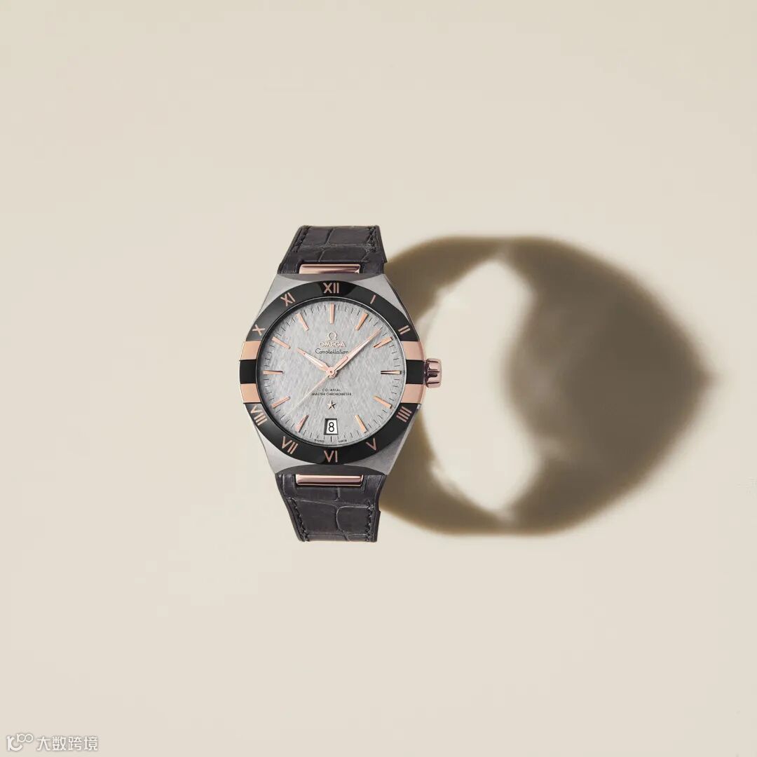 这款41毫米精钢与Sedna 18K金腕表,搭配黑色抛光陶瓷表圈和由OMEGA Ceragold®技术制成的罗马数字时标,并配备丝缎压纹铑灰色表盘,6点钟位置设有日历窗。指针、欧米茄品牌标识、星徽标识以及拱形小时刻度均以Sedna 18K金打造。