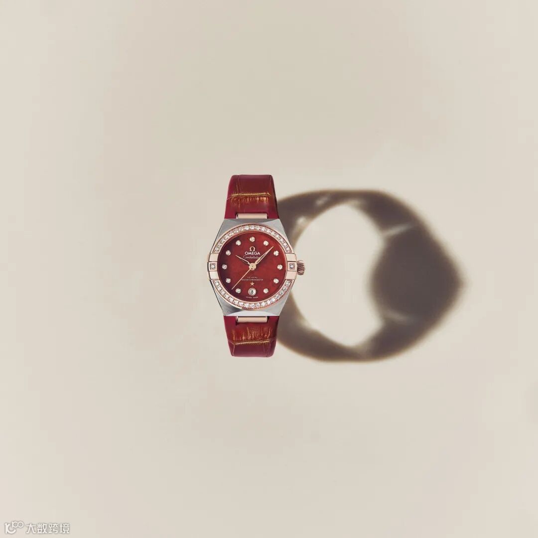 这款腕表的表壳为29毫米,搭配红色砂金石表盘,以及同色亮面皮表带,十分引人瞩目。