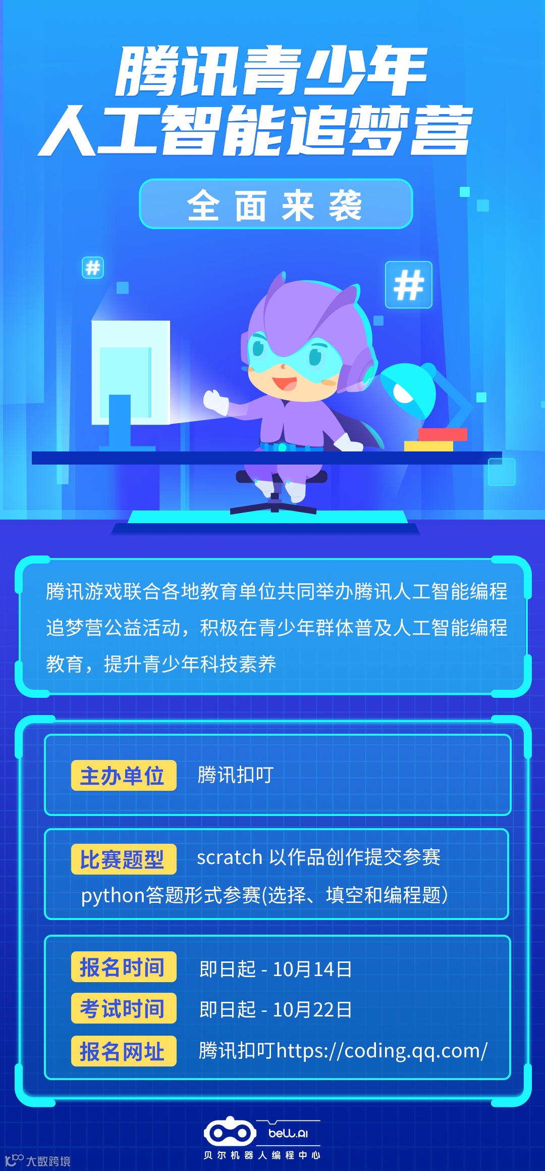 本次赛事由腾讯青少年人工智能追梦营联合各地教育部门合力举办,是规模和影响都比较大的编程活动,贝尔有幸成为本次官方参赛机构之一,将带领贝尔学子进行多元化课程集训,赛前模拟参赛内容,助力孩子顺利晋级!