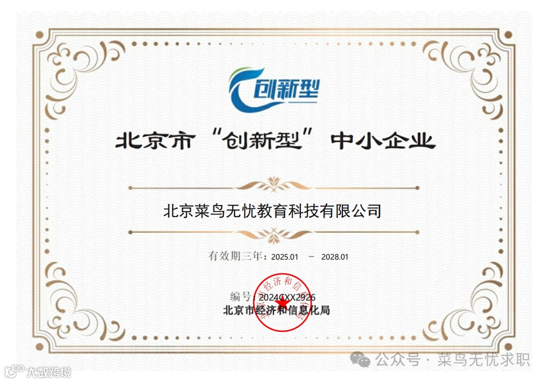 市经济和信息化局公告了新一批北京市创新型中小企业名单!菜鸟无忧荣获北京市“创新型”中小企业荣誉认证,这是对菜鸟无忧在创新领域所取得成就的高度认可,更是对菜鸟无忧持续推动行业进步、引领技术发展的充分肯定。