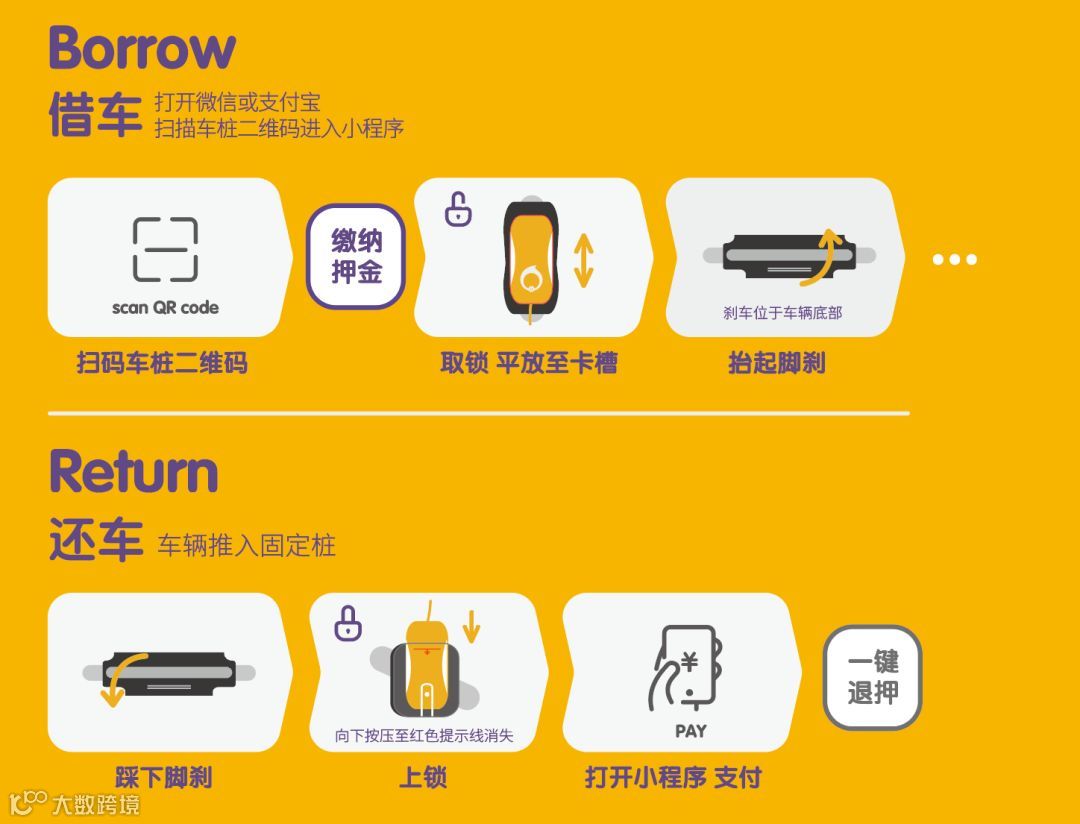 4、用完推车,将车辆归还至停车点,长按车身“还车”按钮归还车辆;