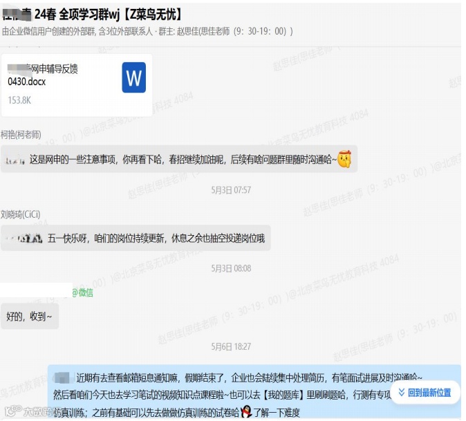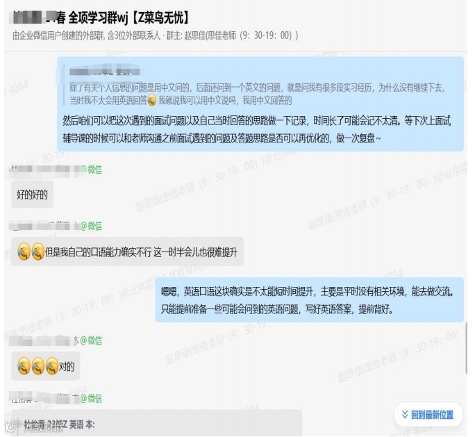 接入菜鸟无忧的第一天,杜同学便感受到了前所未有的专业与细致。班主任赵思佳老师与她进行了深入的沟通,了解她的个人背景、求职意向及存在的困惑。随后,老师为她量身定制了求职策略,从简历优化到面试技巧,每一步都力求精准到位。辅导老师对杜同学的简历进行了大刀阔斧的修改,不仅突出了她的英语专业优势,还巧妙地融入了她的校园活动、比赛及社会实践经历,使简历更加生动、有说服力。
