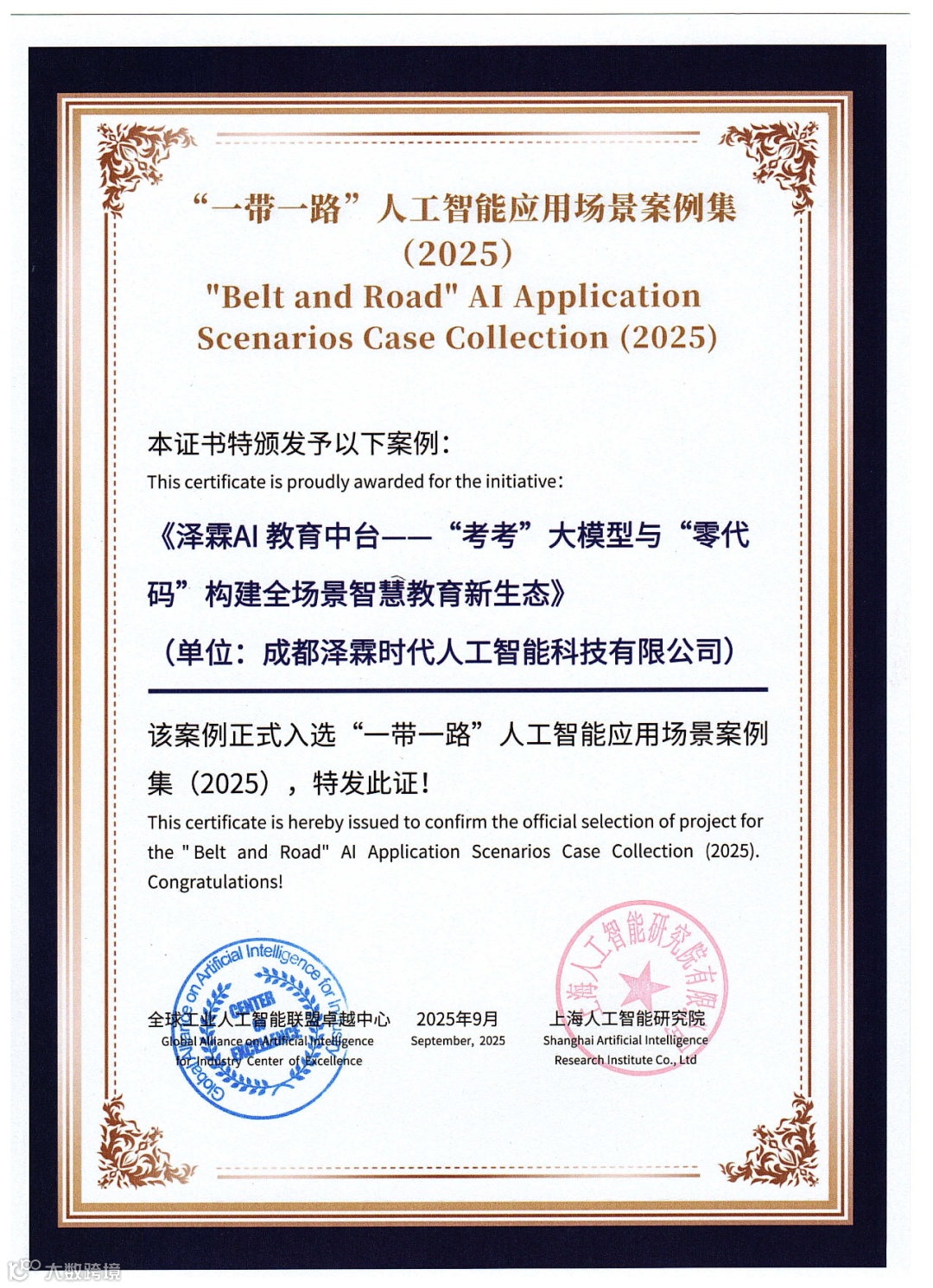 在全球科技变革风起云之际,泽霖智能作为行业先锋,于海外业务拓展中再传捷报 —— 成功入选 “一带一路” 人工智能应用场景案例集(2025)。这一重大成果,不仅是对泽霖智能技术实力与创新能力的高度认可,更是我们在国际舞台上绽放光芒的有力见证。