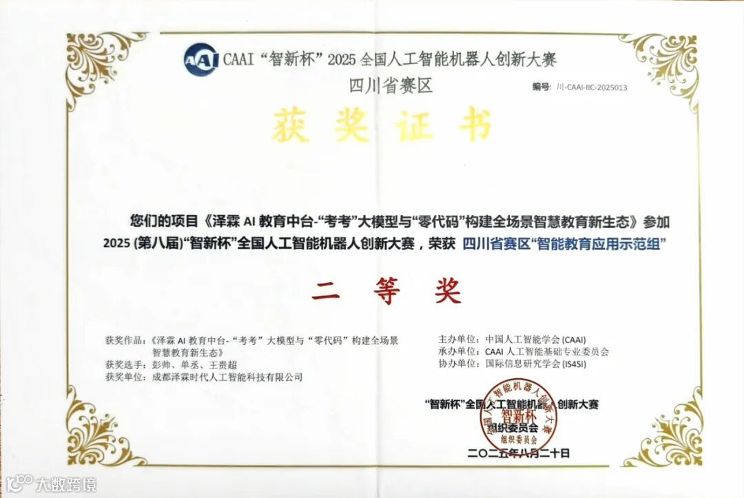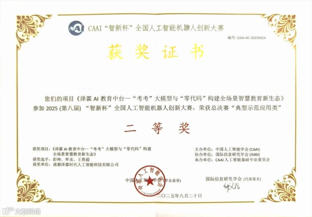 8月20日,由中国人工智能学会(CAAI)主办的第八届“智新杯”全国人工智能机器人创新大赛颁奖仪式在北京隆重举行。本届大赛以“智能创新·人机共融”为主题,聚焦人工智能前沿研究与机器人创新应用。成都泽霖时代人工智能科技有限公司参赛项目——《泽霖AI教育中台“考考”大模型与“零代码”构建全场景智慧教育新生态》,凭借其在智能教育领域的创新理念与技术实践,荣获四川省赛区“智能教育应用示范组”二等奖,并晋级全国总决赛,再获“典型示范应用类”全国二等奖,体现了公司在AI+教育融合应用方面的扎实能力与前瞻布局。