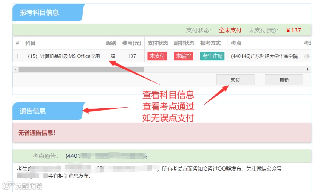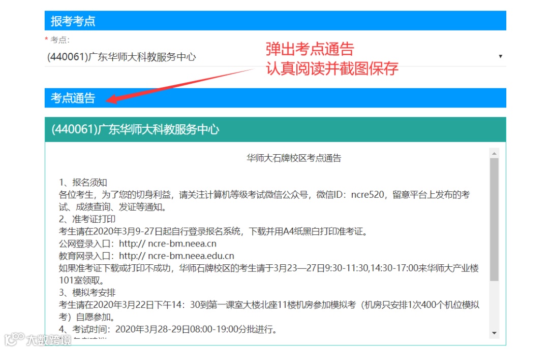 认真查看“考点通告信息”并截图保存(相当重要),如考点没有设置通告的忽略此步骤。
