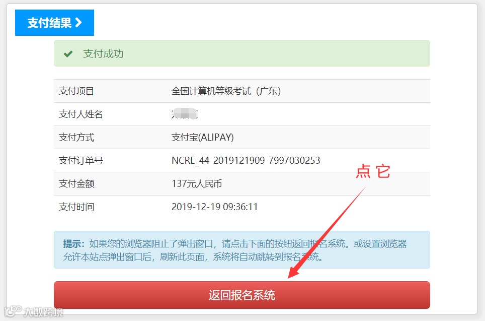 7.支付之后,等网页跳出支付成功界面,点“返回报名系统”,如下图。