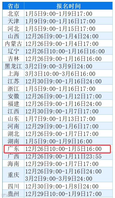 ⏰部分省份将于明天报名,如广东省的报名时间是12月26日10:00时至1月5日16:00,考试时间为2026年3月28-30日。