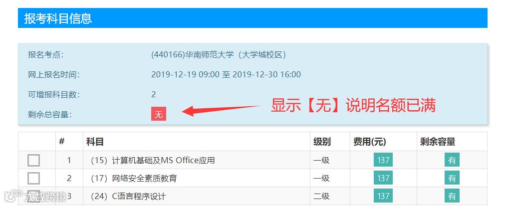 2.如下图,选考点的时候,【剩余总余量】出现【无】的提示,说明名额已满,不能再报这个考点,只能选择其他考点。