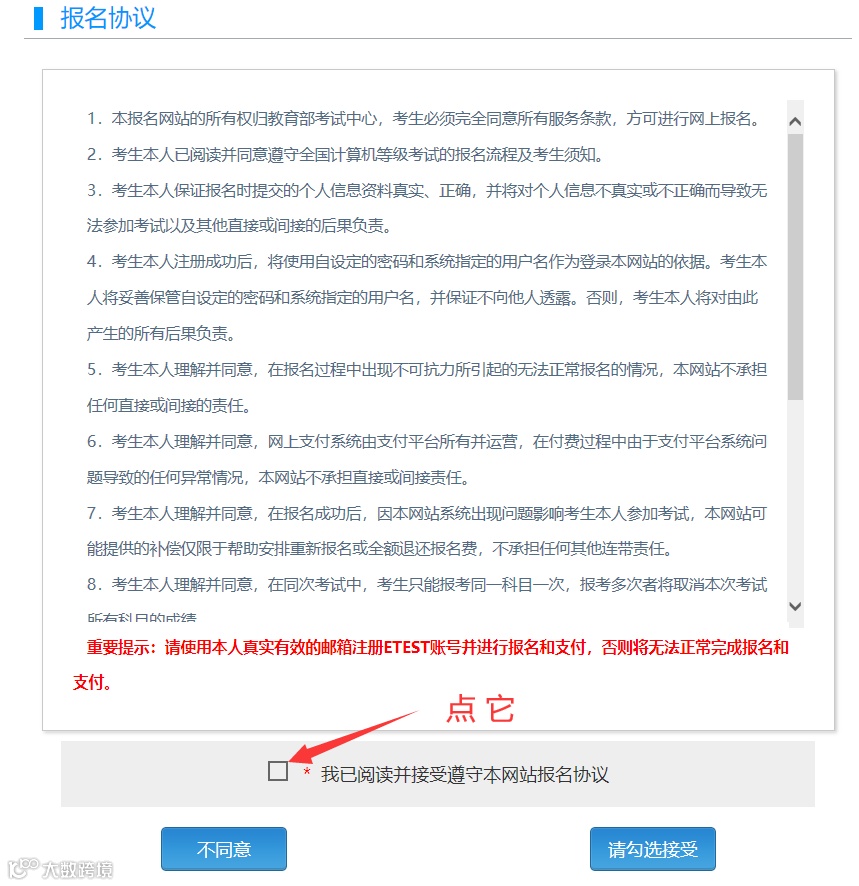 登陆后,点击“开始报名”,认真阅读报名协议及其考试注意事项,最后打勾点“我同意”。