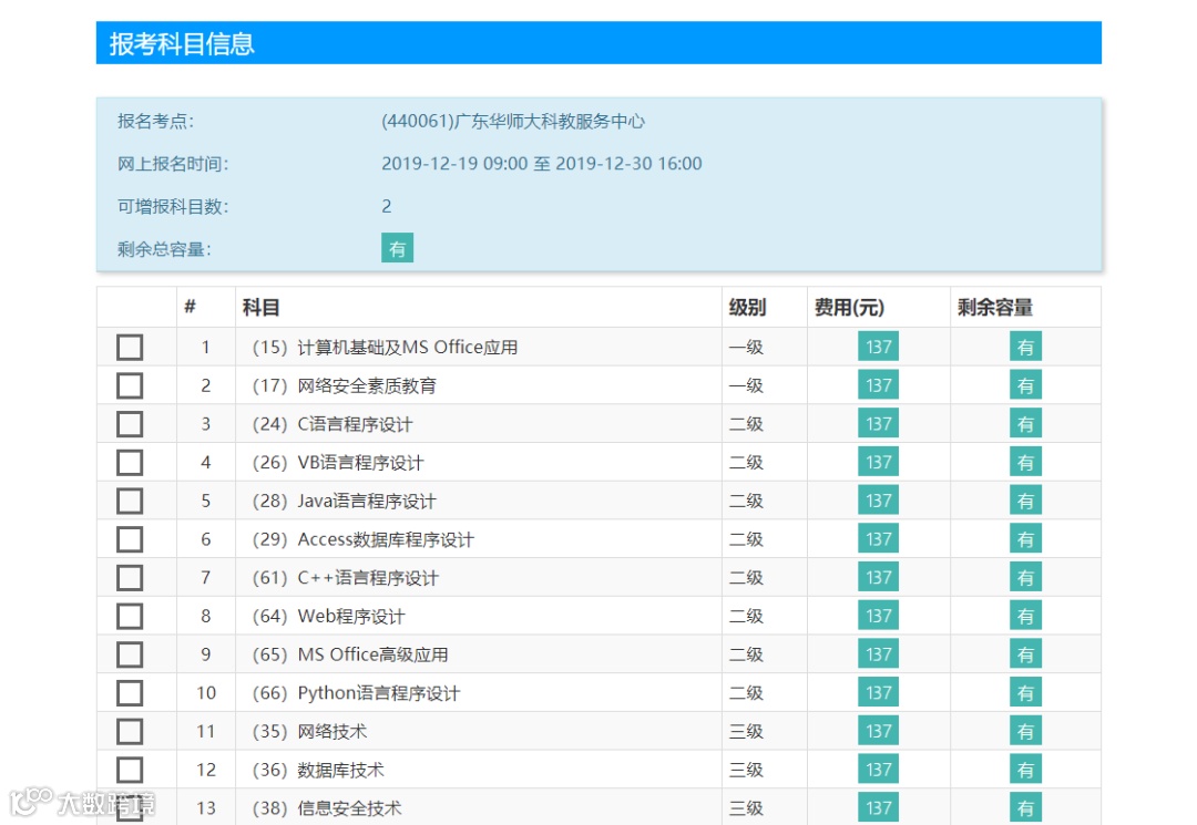 1.同次考试同一考生只能在一个省级承办机构的一个考点报名,最多可报3个科目,且不允许重复报考同一个科目,有些考点规定一次只能报一个科目,注意选报考点的要求。