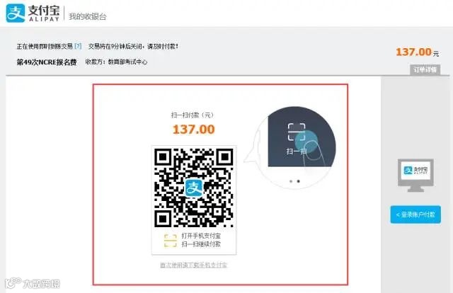 6.网页出现支付界面,打开手机支付宝,并用扫一扫功能扫下图二维码进行支付。