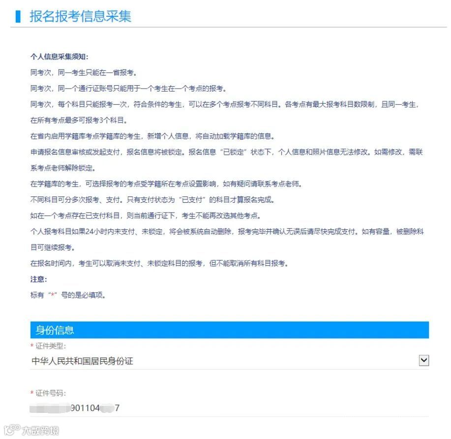 考生报名时须填写有效身份证件号码,有效身份证件包括居民身份证(含临时身份证)、港澳居民来往内地通行证、台湾居民来往大陆通行证、港澳台居民居住证、护照。