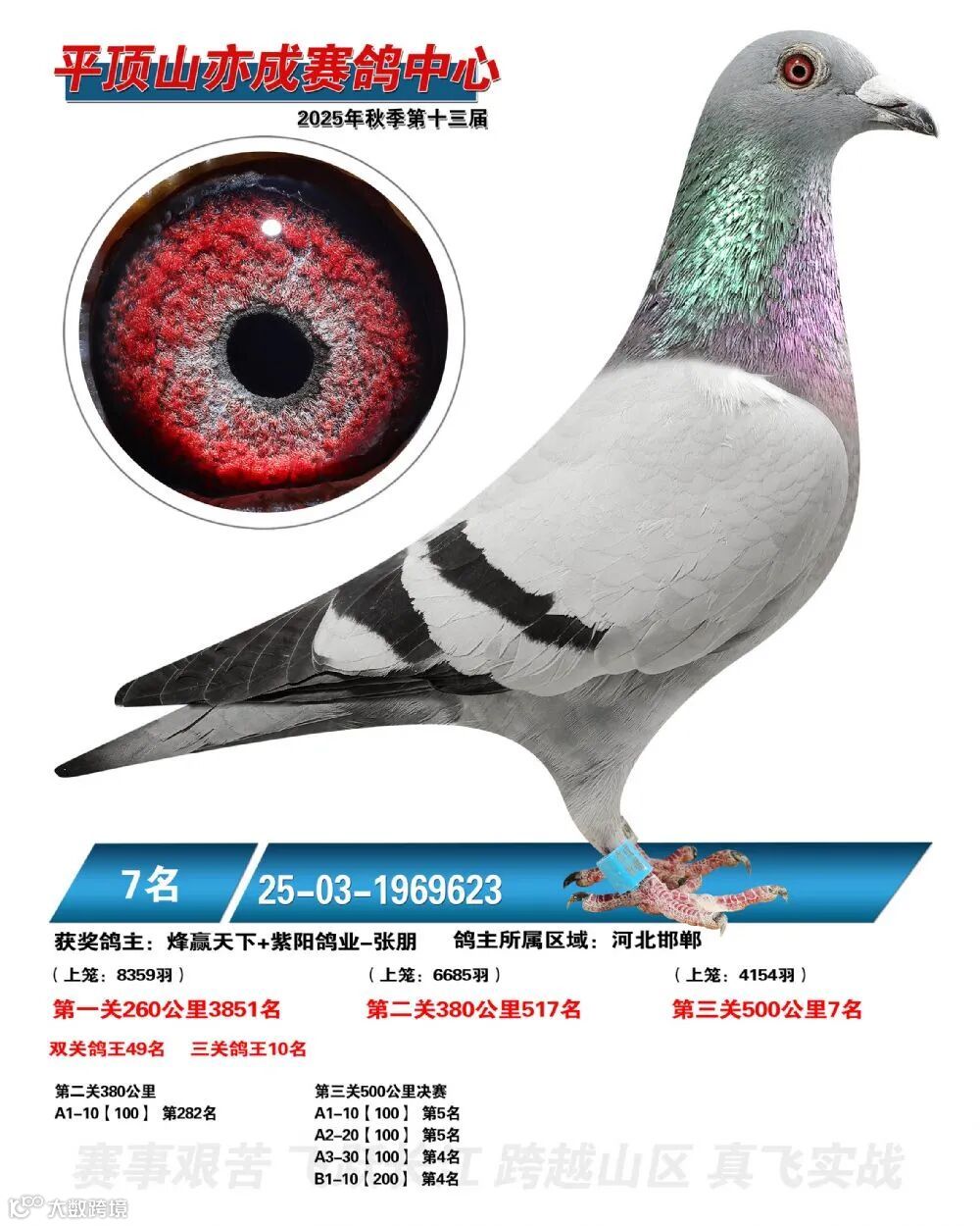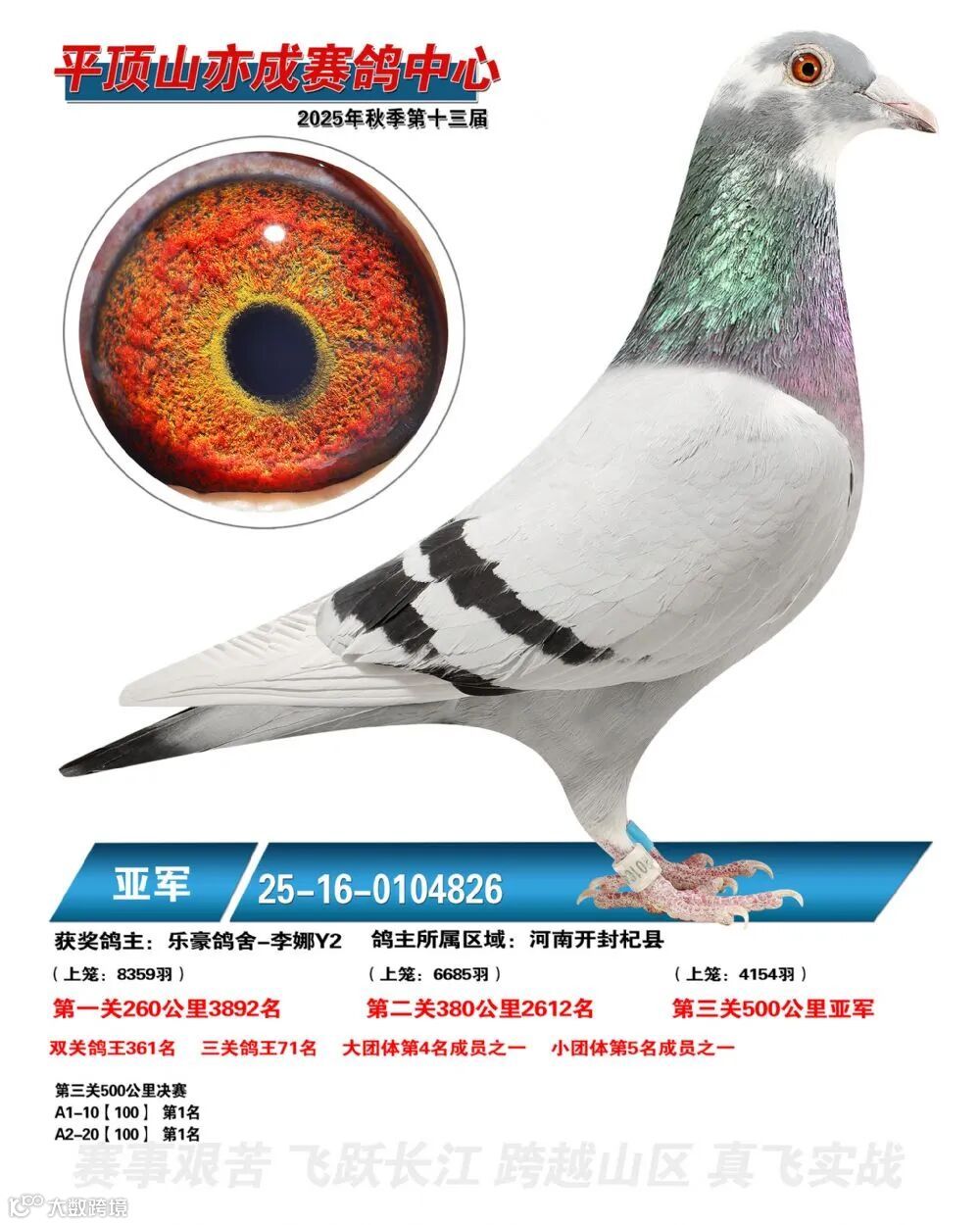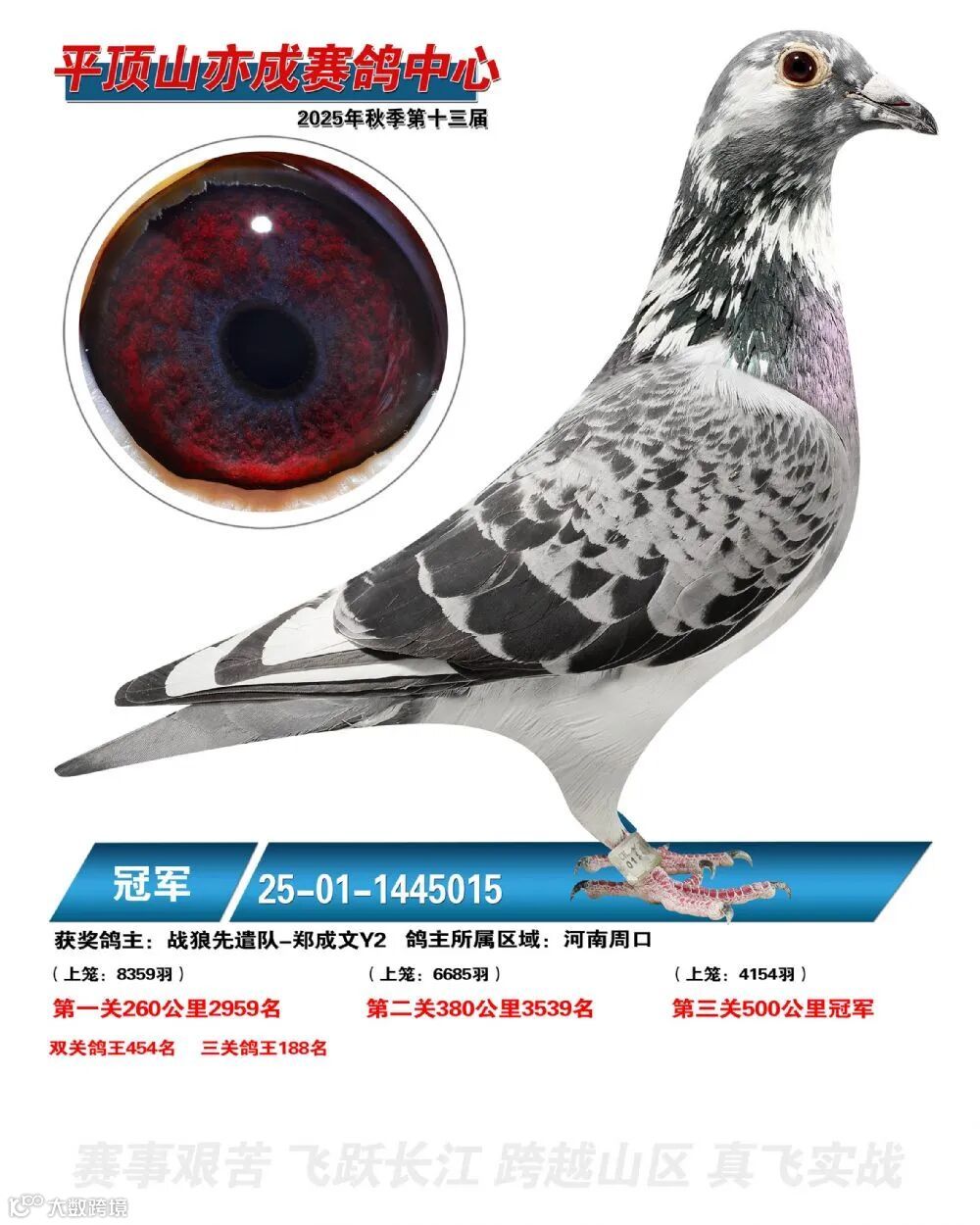 十三载匠心办赛,十三届实战选将——河南平顶山亦成秋棚,以严苛铸标准,以豪情续新篇。2025秋赛,跃长江、跨峻岭,十四站训放淬火成钢,收费站、资格站、三关正赛试炼,只为遴选实战真英雄。2025秋赛再创辉煌,本届收鸽13259羽,穿越层层关卡,至决赛一千多羽精英杀出重围,羽羽皆英豪。最终,战狼先遣队-郑成文麾下猛将,环号2025-01-1445015雨花一骑绝尘,以1652.9459米/分的高分速斩获决赛冠军。三关鸽王冠军之争,同样扣人心弦。此项最高荣誉由周根尚名下悍将实力加冕!此鸽环号2025-16-0329282,以首关271名、二关135名、决赛34名的精彩表现夺得。这羽0329282三关鏖战毫不退缩,以稳制胜,最终积小胜为大胜,荣登鸽王冠军宝座。