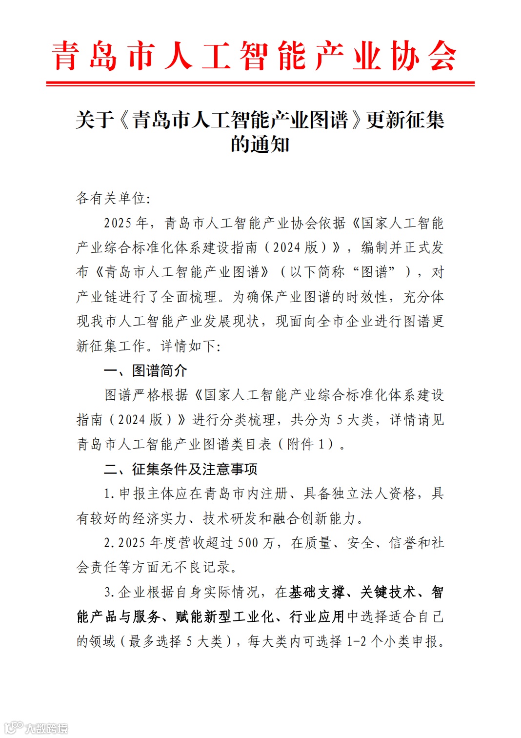 2025年,青岛市人工智能产业协会依据《国家人工智能产业综合标准化体系建设指南(2024版)》,编制并正式发布《青岛市人工智能产业图谱》(以下简称“图谱”),对产业链进行了全面梳理。为确保产业图谱的时效性,充分体现我市人工智能产业发展现状,现面向全市企业进行图谱更新征集工作。详情如下: