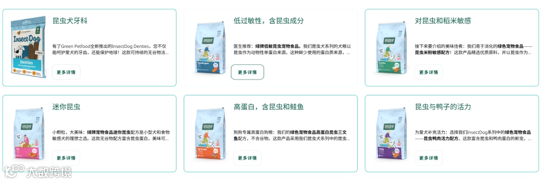 比如欧洲市场:英国品牌Yora使用黑水虻幼虫作为唯一动物蛋白,部分产品中昆虫成分占比可达40%以上,主要针对敏感肠胃或食物过敏犬只;德国Green Petfood推出的InsectDog系列,则在强调“低敏”“无谷”的同时,获得多项本土可持续相关认证。法国市场上,Tomojo等品牌同样以昆虫蛋白构建差异化,但整体仍属于功能型细分品类。