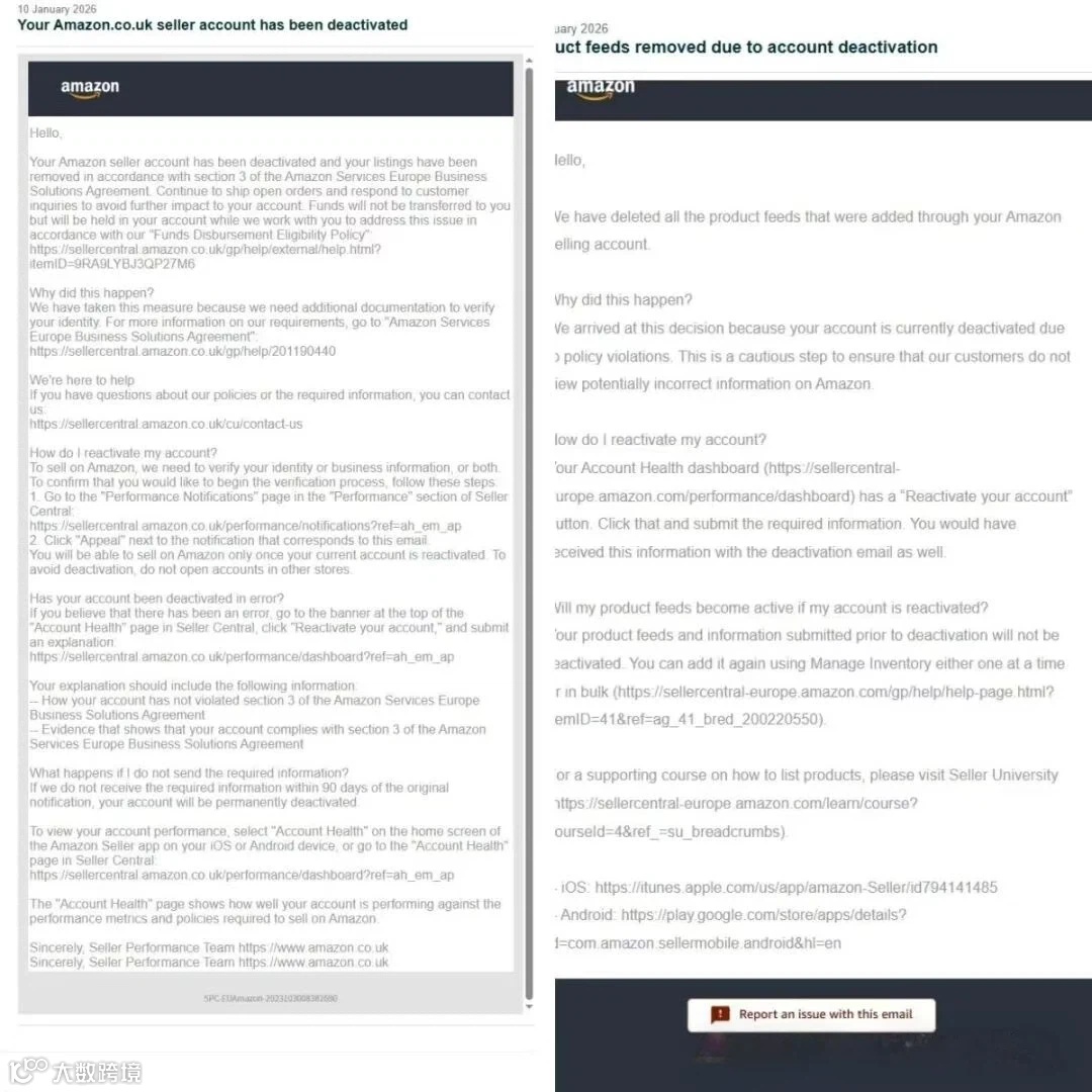 平台通过两类通知定向处置:一类以“协议第 3 条” 为由停用账户,要求补充身份验证文件;另一类以 “政策违规” 暂停权限,开放重新激活入口。目前多数卖家已完成材料提交,但审核结果尚未公示。