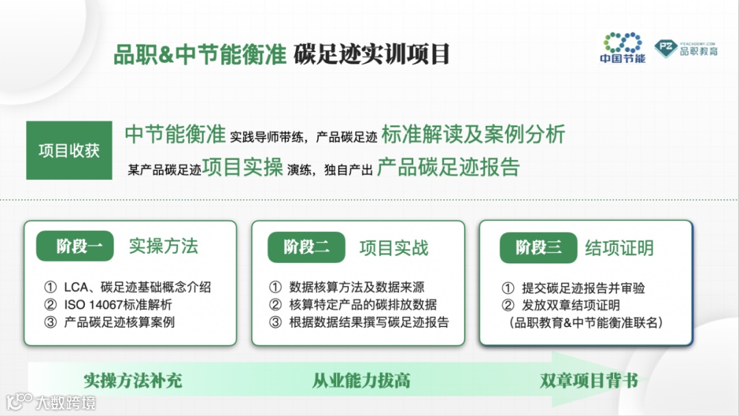 以环保行业为例,我们推出了中节能衡准的碳足迹实训项目,这个项目需要学员进行产品碳足迹的标准解读及案例分析,独自产出产品的碳足迹报告。
