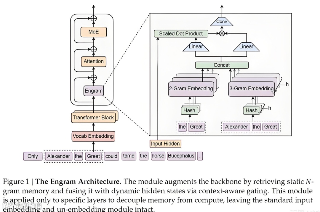 - Engram模块:专用静态知识检索,支持O(1)条件索引(非向量相似搜索),可预载入CPU内存加速访问。