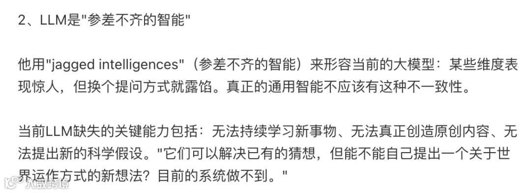 当前大模型表现极不稳定——状态好时如开挂,状态差时逻辑混乱;同一问题换提示词,结果天差地别;短任务稳健,长任务频出幻觉。DeepMind创始人Demis Hassabis将其精准定义为“参差不齐的智能(jagged intelligence)”。
