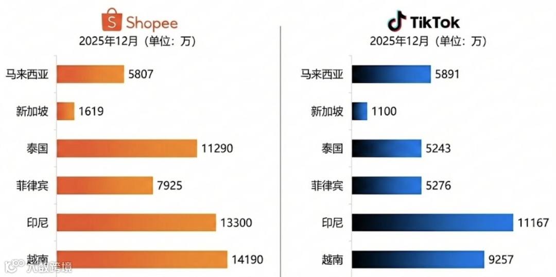 据2025年12月Shopee与TikTok Shop在东南亚六国的最新访问量数据,老玩家守势趋紧,新势力攻势凌厉。