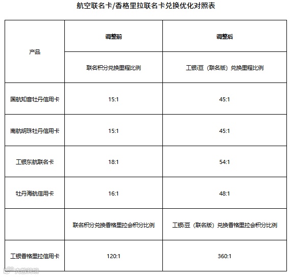 (一)航空联名卡(包括国航知音牡丹信用卡、南航明珠牡丹信用卡、工银东航联名卡、牡丹海航信用卡)积分兑换形式将由“有效消费累积联名积分自动兑换里程”调整为“有效消费累积工银i豆(联名版)自动兑换里程”;工银香格里拉联名卡积分兑换形式将由“有效消费累积联名积分自动兑换香格里拉会积分”调整为“有效消费累积工银i豆(联名版)自动兑换香格里拉会积分”。