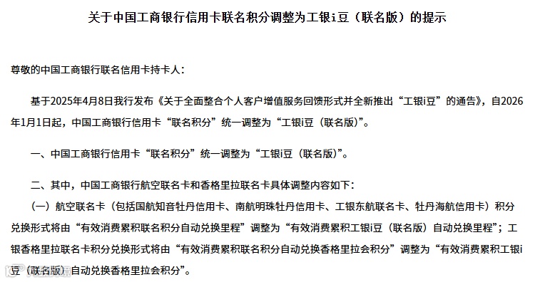 (三)调整后的联名卡有效消费采集范围(线下有效消费,我行规定的线上交易、第三方绑卡交易等不予累积的特定交易除外),消费兑换形式(刷卡有效消费累积的工银i豆(联名版)自动兑换航空里程/香格里拉会积分),兑换周期(按月,以我行与航空公司/香格里拉集团实际传输兑换为准)均保持不变。新增有效消费和存量联名积分均根据“消费1元人民币(或等值外币)累积3个工银i豆(联名版)”的规则,在2026年1月内由系统自动转换。