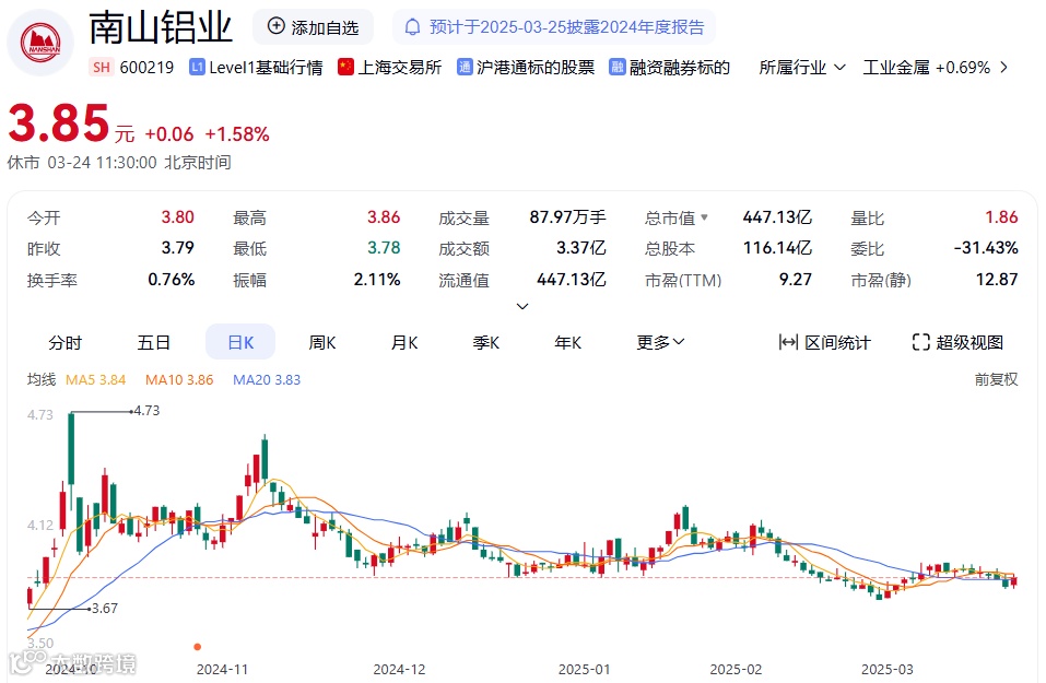 南山铝业国际母公司为山东南山铝业股份有限公司,后者于1999年12月在上交所挂牌上市(股票代码:600219.SH)。截至发文前,南山铝业A股涨1.58%,报3.85元,总市值约479亿港元。