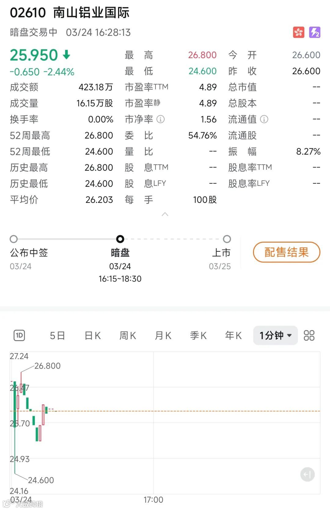 3月24日,南山铝业国际(02610.HK)开启暗盘交易,由摩根士丹利和富瑞金融联席保荐。发行价为26.60港元(按下限定价),截至发文前,股价跌2.44%,报25.95港元,总市值152.65亿港元。