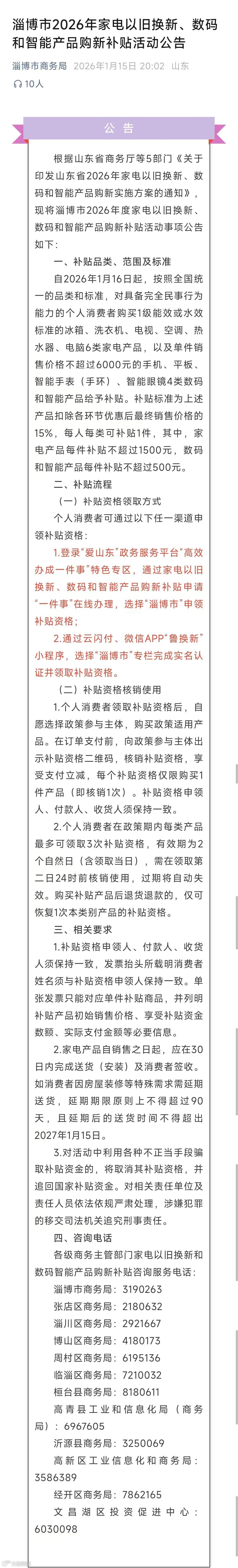 淄博市2026年家电以旧换新、数码智能产品购新补贴活动公告: