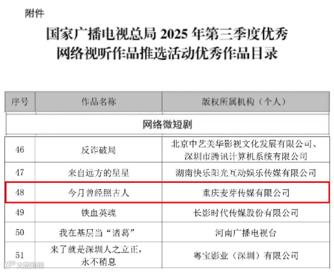 此前,该剧已获“光影新重庆”——重庆市第十一届网络影视剧(微视频)大赛微短剧一等奖,入选文化和旅游部艺术发展中心2024-2025品质文旅短剧推荐片单、中广联合会2025年上半年精品非遗短剧推介片单,获得多方认可。