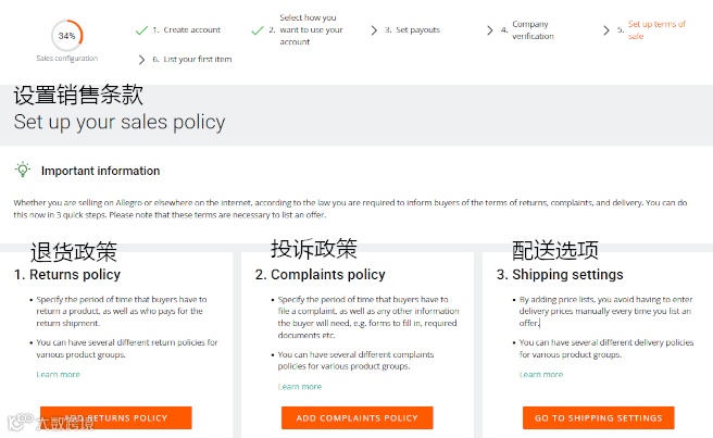设置您店铺的退货政策、投诉政策及配送选项(如果您在波兰有仓库,则需要上传VAT信息,如果您是自发货商家,可以暂时先不上传VAT)。