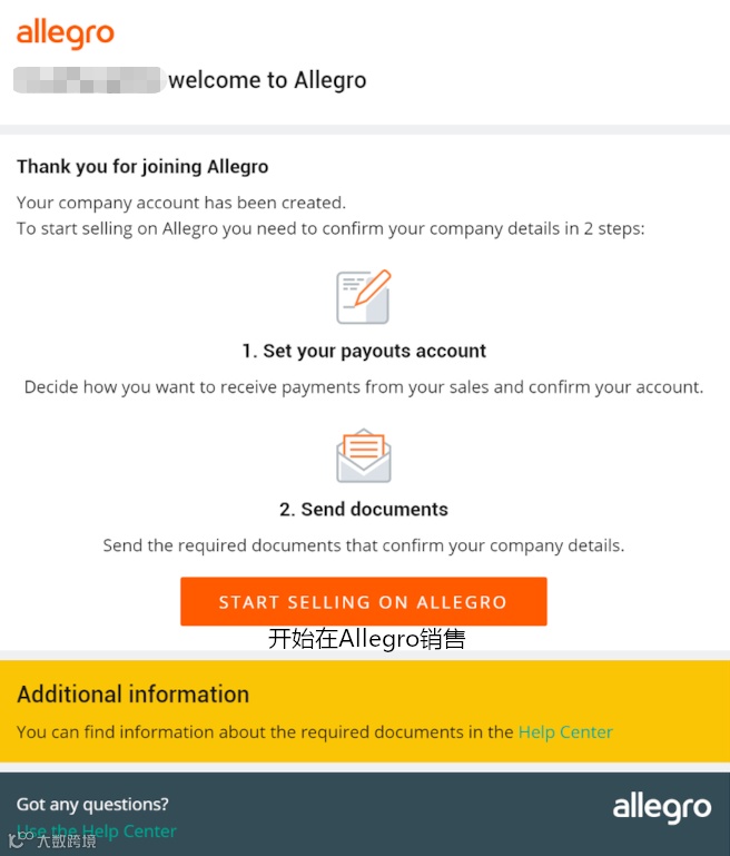 账户注册完成后,将会收到激活账户的销售功能的电子邮件。点击“Start Selling on Allegro”按钮。