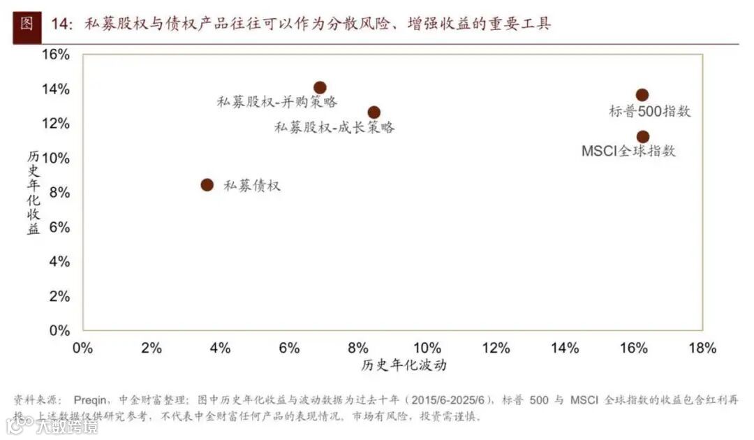 全球私募股权与债权产品是指以非公开方式募集资金、主要投资于非上市公司股权或非公开交易债权的产品。截至2024年底,两者的规模分别高达10万亿美元和1.5万亿美元,合计占全球另类资产的75%左右,是投资者构建全球资产配置组合不应忽视的资产类别。过往由于复杂度较高,相关产品主要由机构投资者所持有。但随着另类市场产品结构的创新和金融科技的进步,越来越多的高净值投资者开始对其进行战略配置。