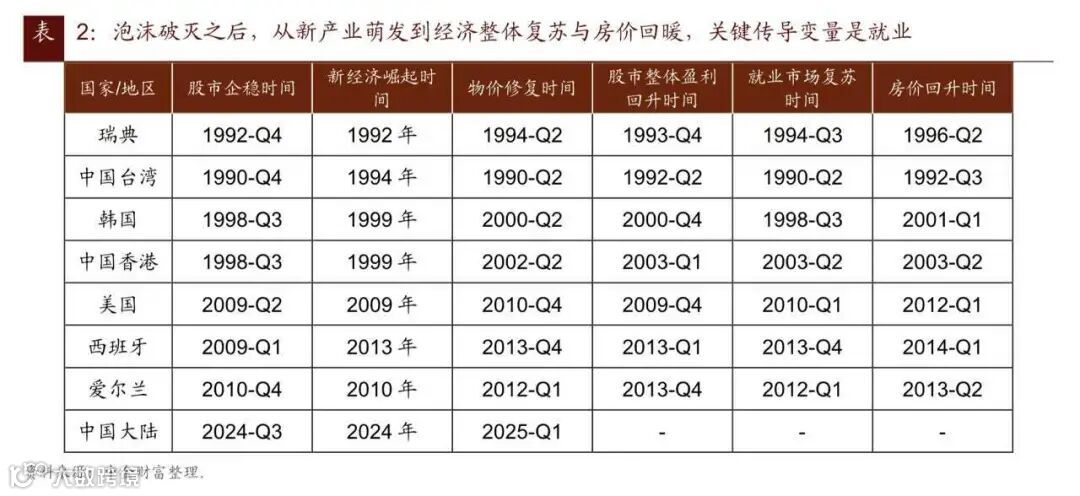 好消息是,历史上经历类似阶段的案例中,绝大部分案例都能最终走出困境,实现经济的转型和复苏。从房地产价格下跌开始,若干年之内会先后实现股市企稳回升、就业和收入增加,并最终实现房价的企稳回升。像日本这样经历数十年长期停滞的才是极少数的特殊案例。那么,如何判断一个经历了地产危机的经济体,是否正在焕发转型和复苏的动力呢?我们认为最关键的观察点有两个:
