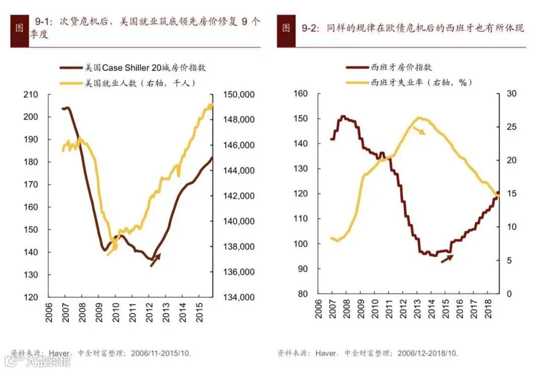 从海外的经验来看,劳动力市场是关键中间变量。如果就业人数开始止跌回升,接踵而至的就是居民收入和消费支出的回升,并在一段时间后(通常为1-2年)转化为房地产价格的企稳回升。
