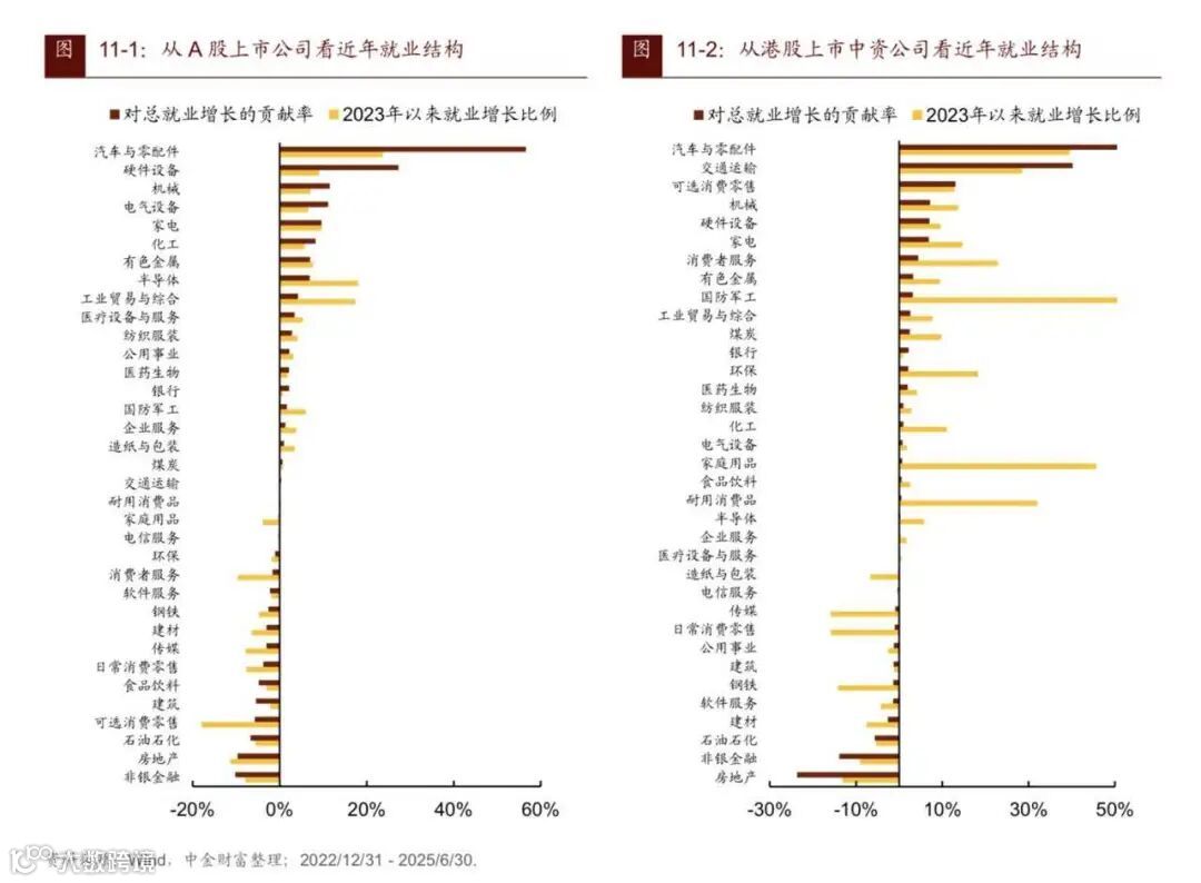 中国上市公司的就业统计也呈现出类似的新旧替代特征。2023年以来,上市公司口径的大部分新增就业来自于新经济行业,特别是汽车、机械设备、电气设备、有色金属、家电、半导体等行业。而非银金融、房地产、建筑和材料、传统能源、传统零售是主要的就业损失行业(图11-1)。我们也统计了港股的样本,结论与A股十分相似,除了各类硬件科技企业之外,科技平台类企业(包含在可选消费零售等)也成为就业岗位的增长来源(图11-2)。