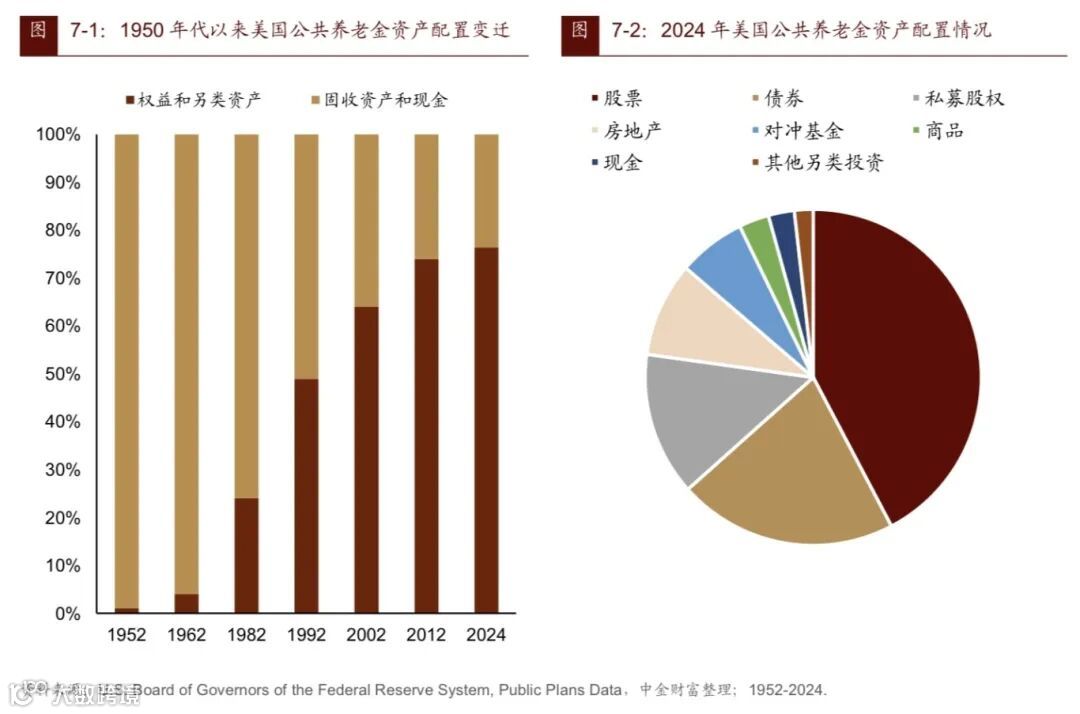 1970年代后,美国DC养老账户开始出现,投资风险回归员工个人。为了跑赢通胀并获得超额收益,个人投资者被教育(且事实证明)必须超配股票。自此,美国养老金的股票配置中枢趋势性抬升。到2024年,美国州与地方养老金(包括教师、警察、市政雇员养老金等)的配置中,固收类资产占24%,股票、基金、另类产品占76%。在过去半个世纪完成了从“偏债配置”向“偏股配置”的持续转型,并深刻影响了美国资本市场。