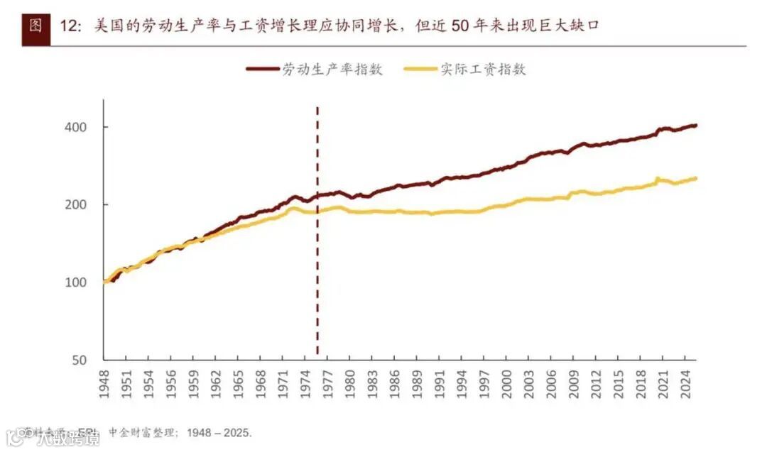 “外交政策始于国内”。美国的“转身”实际上是过去数十年来以分配不均为核心的一系列矛盾的积累结果。从图12可以看到,过去50年,美国每年的实际劳动生产率增长1.2%,但实际工资增长率只有0.6%。特朗普看似“不靠谱”,却能二次上台,反映了美国很大一部分民众不满现状、要求改变的诉求。特朗普也绝非美国唯一的此类政治人物,在2025年纽约市长的选举中,来自左翼的马姆达尼持租金控制和城市服务公有化等非传统主张,击败民主党建制派候选人而当选。这印证了美国的问题不仅是“乡下人的悲歌”(美国副总统万斯的作品书名),也同样困扰着大都会的工薪阶层。