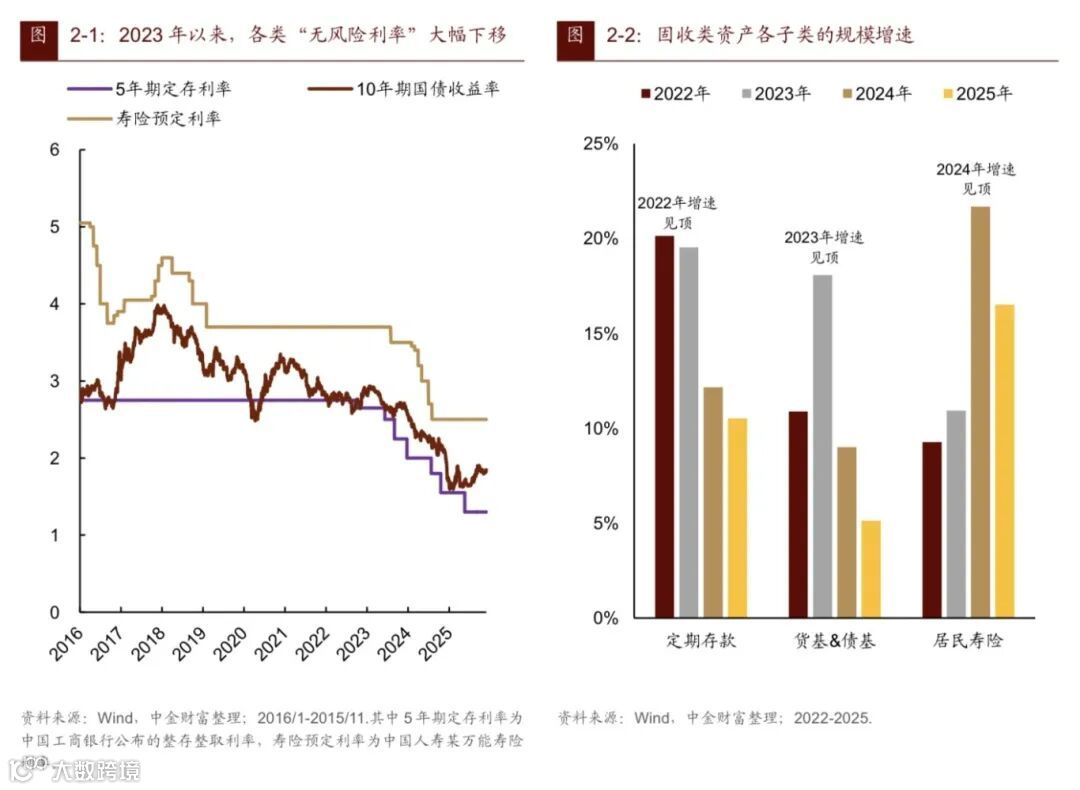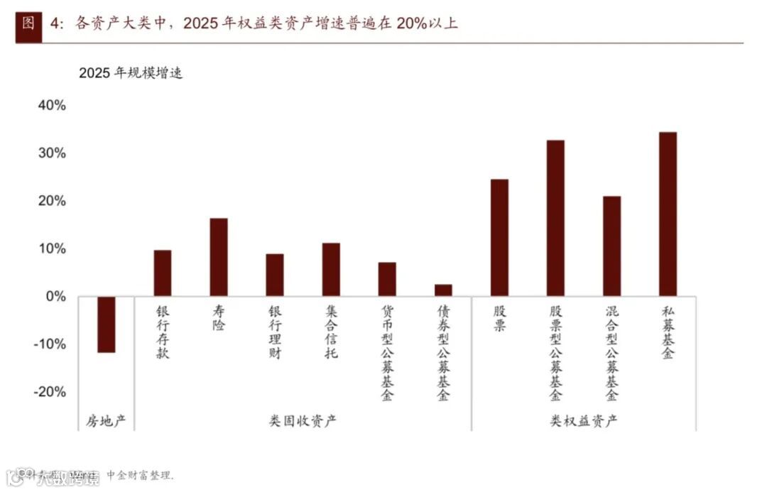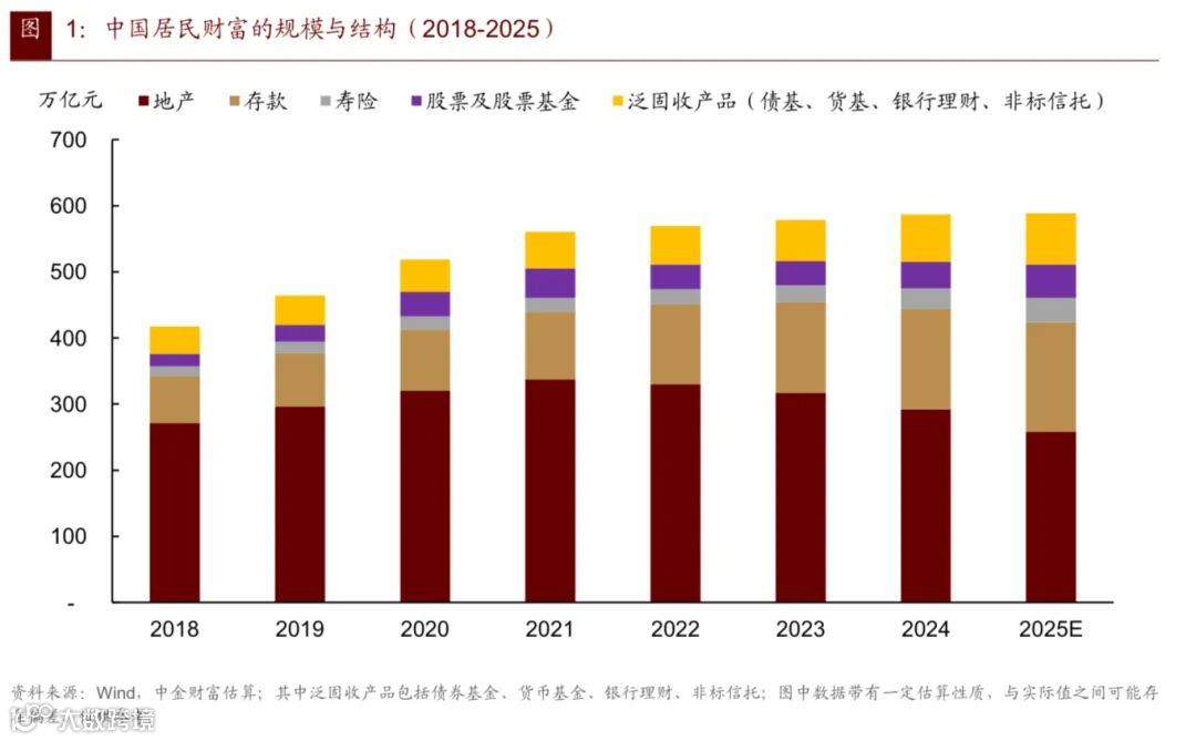 避险的心态依然普遍,为未来的再配置提供了充足的“弹药”。在2024年,银行存款、泛固收类产品(包括债券基金、货币基金、银行理财、非标信托)的总规模年均增速约为13.3%,远超过整体财富的增长速度(约1.5%)。而到了2025年,这一增速回落为10.3%,虽已不是增长最亮眼的资产类别,但说明很大一部分居民,特别是对资本市场接触较少的家庭仍然在持续积累避险资产。反过来,这也为未来的财富再配置提供了充足的潜在“弹药”。